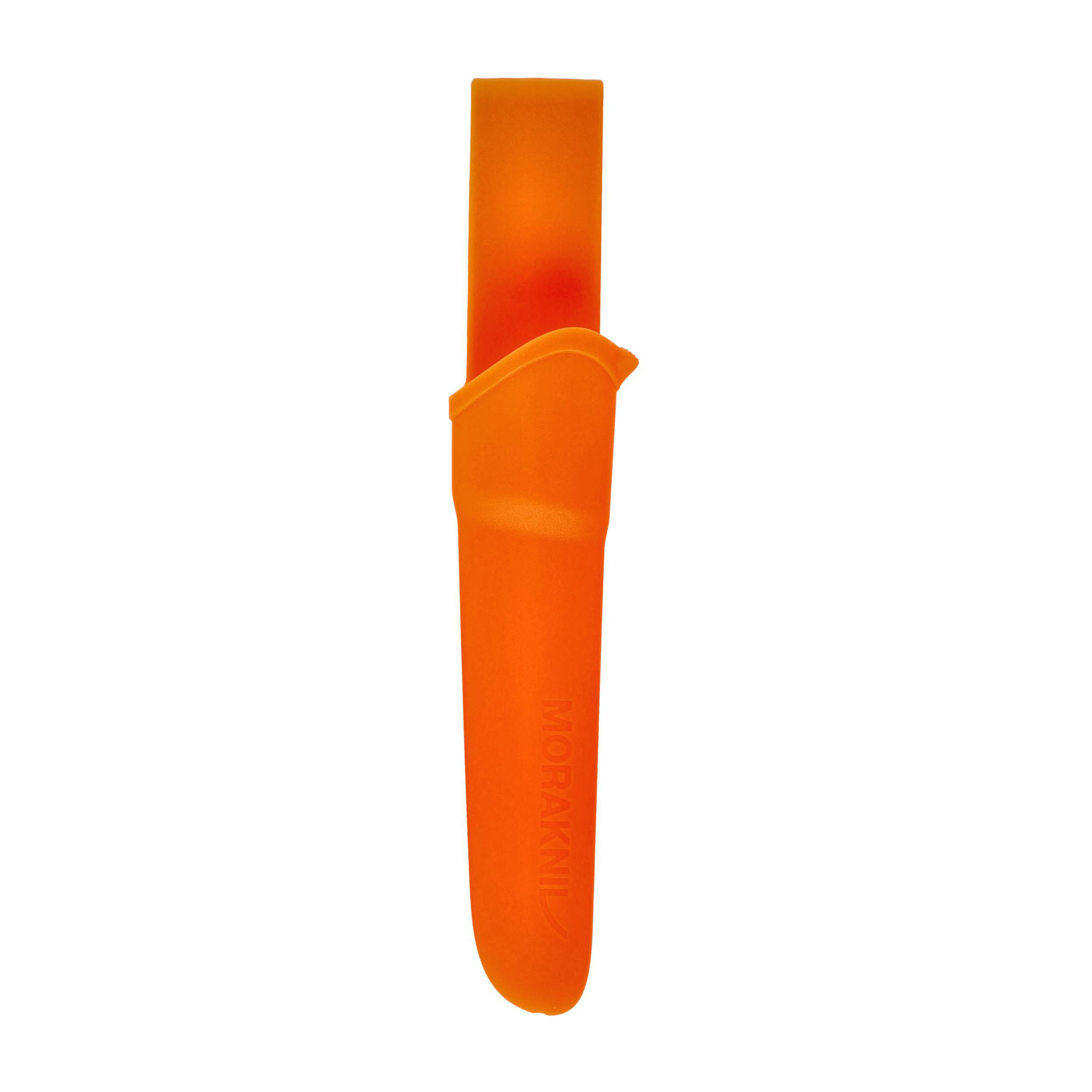 Pomarańczowa pochwa z tworzywa sztucznego utrzymuje i chroni nóż pewnie w czasie jego troczenia na pasie.