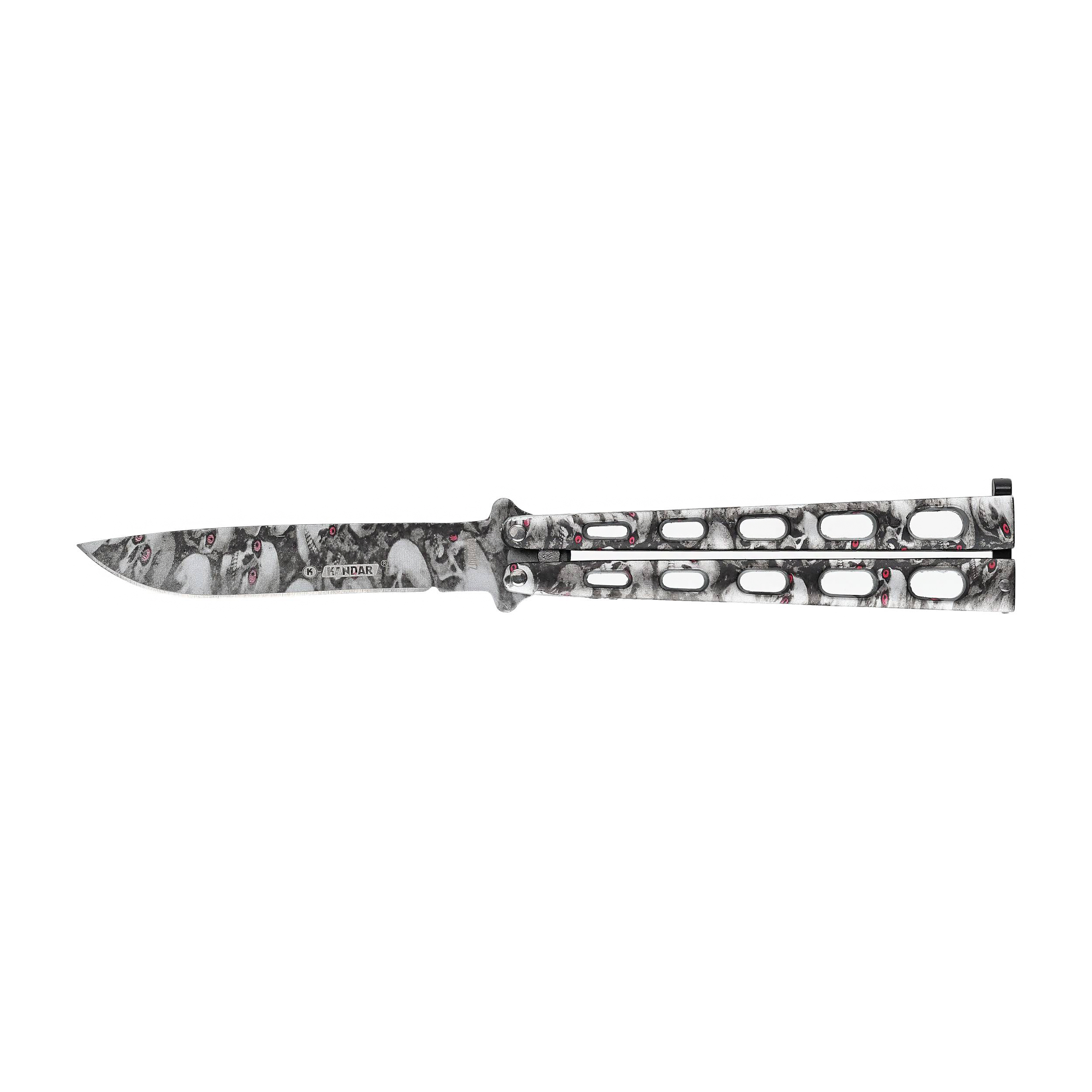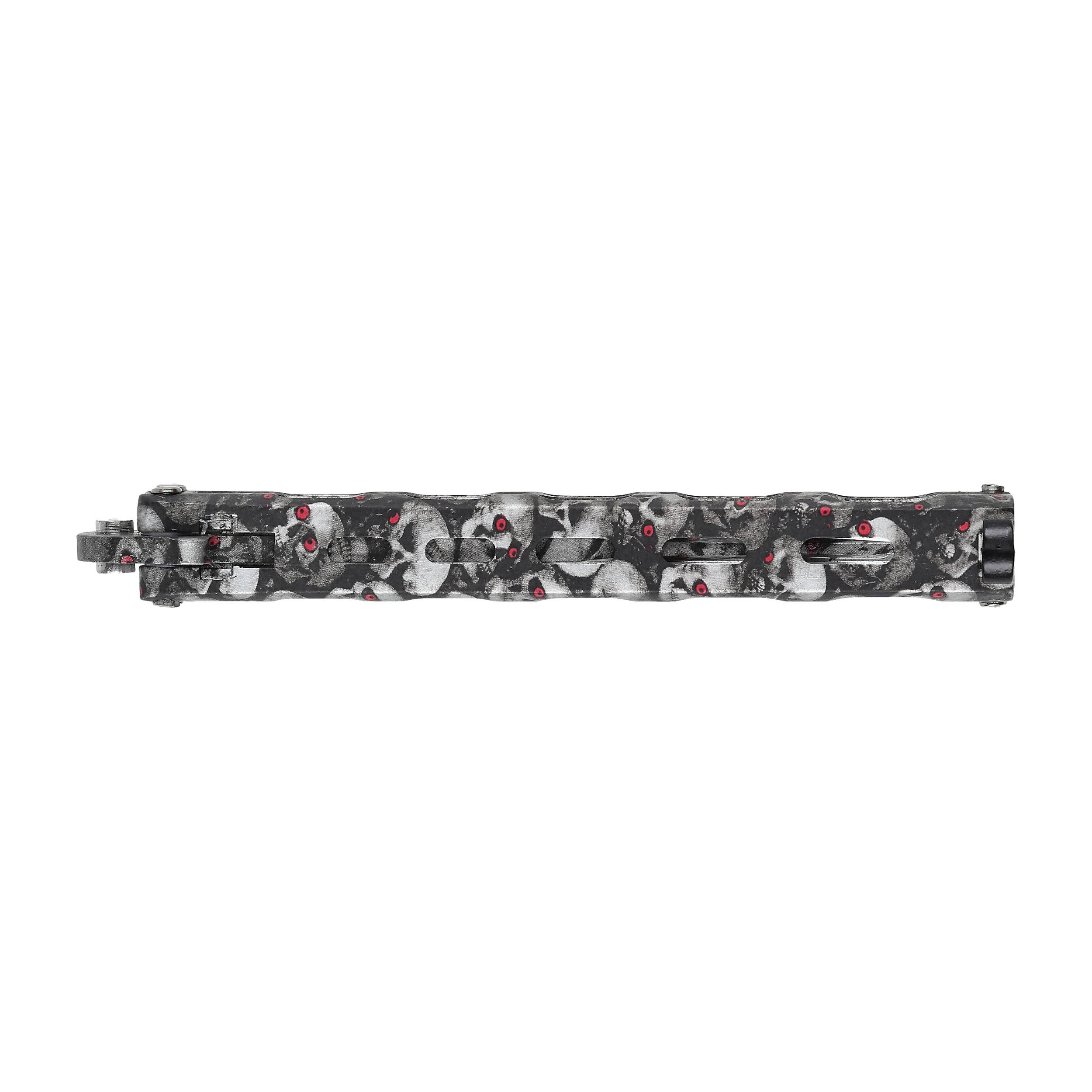 Klingę typu Cllip Point o długości 103 mm wykonano ze stali nierdzewnej. Mocna głownia z łatwością sprosta codziennym zadaniom. Podobnie jak klingę, stalowe ramiona ozdobiono wykończeniem z motywem czaszki. Pomimo niewygórowanej ceny nóż pracuje lekko i płynnie. Za bezpieczeństwo podczas przenoszenia i użytkowania noża odpowiedzialna jest prosta, niezawodna blokada zapadkowa typu latch.