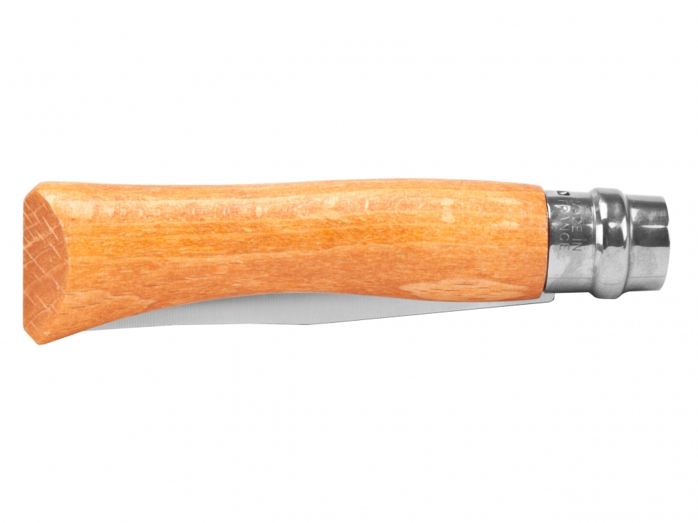Klasyczny i wyjątkowo lekki model francuskiej firmy Opinel, produkującej noże już od ponad 100 lat. Cienkie ostrze z płaskim szlifem wykonane jest ze stali węglowej (stal węglowa jest twardsza od stali nierdzewnej należy natomiast pamiętać o regularnej konserwacji ostrza). Rękojeść z drewna bukowego jest znakomicie wyprofilowana i zapewnia pewny, przyjemny chwyt. Blokadę głowni zapewnia obrotowy pierścień, opatentowany w 1955 roku pod nazwą Virobloc.