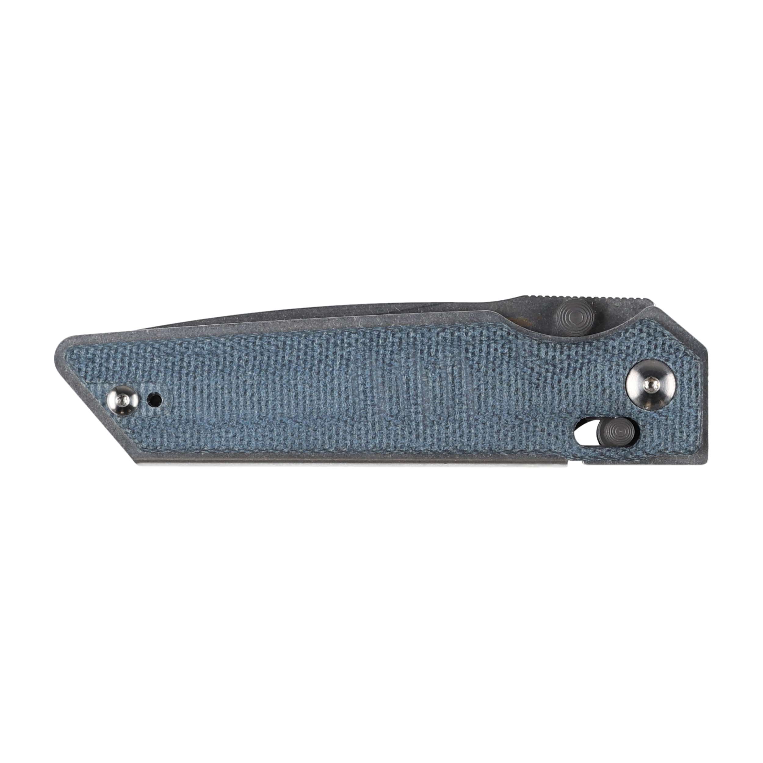 Folder Sacra posiada rękojeść z niebieskiej Micarty – kompozytu powstałego z połączenia prasowanego pod ciśnieniem płótna z syntetyczną żywicą. Chropowata faktura i gładkie krawędzie okładzin sprawiają, że nóż dobrze leży w dłoni. Nóż pewnie leży w dłoni również mokrej lub zabrudzonej.