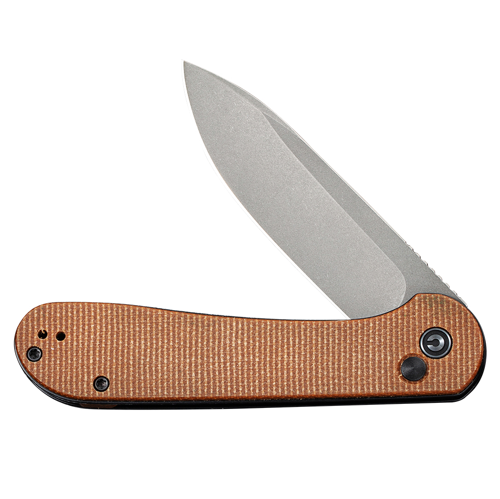 Civivi Elementum posiada rękojeść z brązowej mircarty, czyli kompozytu powstałego z połączenia płótna prasowanego pod ciśnieniem z syntetyczną żywicą. Chropowata faktura okładzin sprawia, że nóż dobrze leży nawet w spoconej dłoni. Dzięki otwartej konstrukcji (ang. open backed) narzędzie można czyścić i oliwić bez większych problemów.