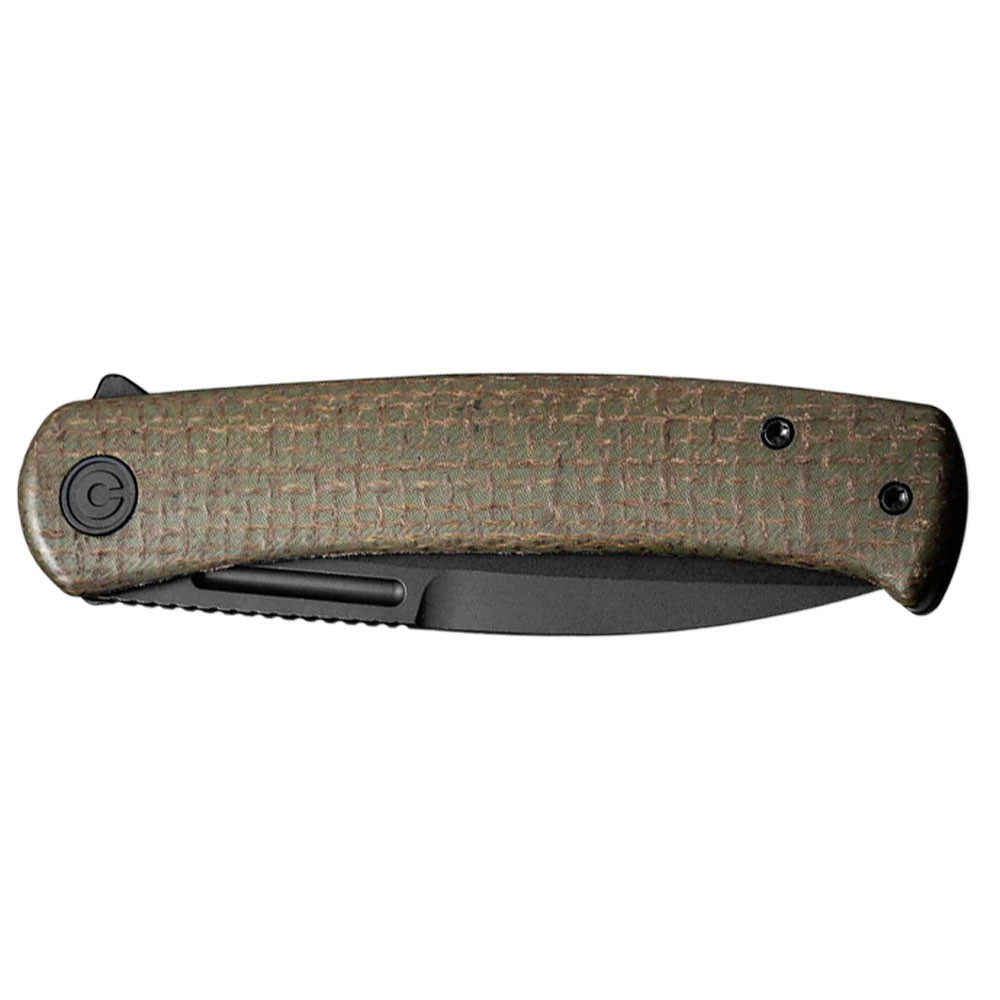 Rękojeść w składanym nożu na stronie prezentacyjnej wykonana została z Micarty w kolorze zielonym, płótna prasowanego pod ciśnieniem z żywicą, zaś od strony blokady ze stali nierdzewnej.