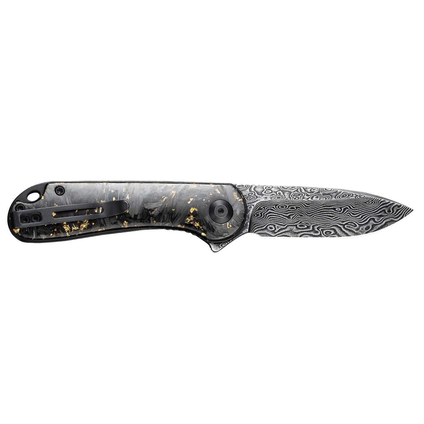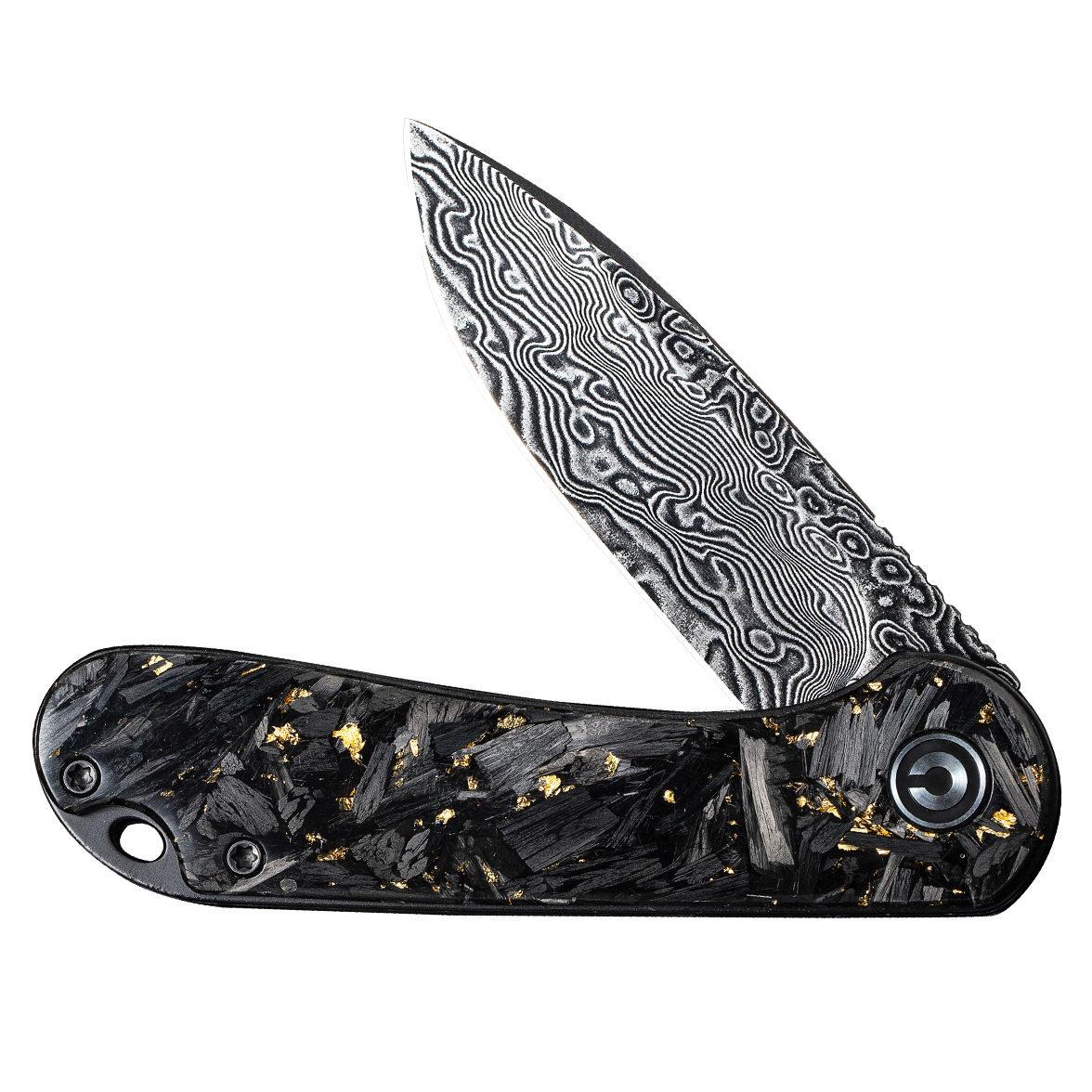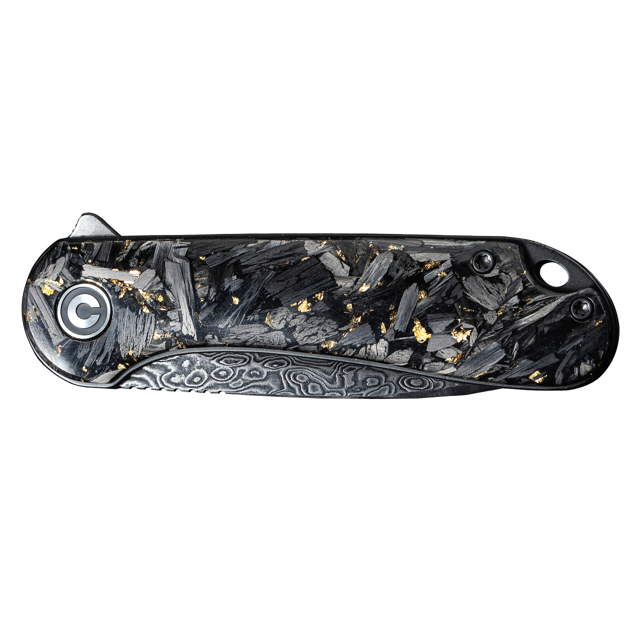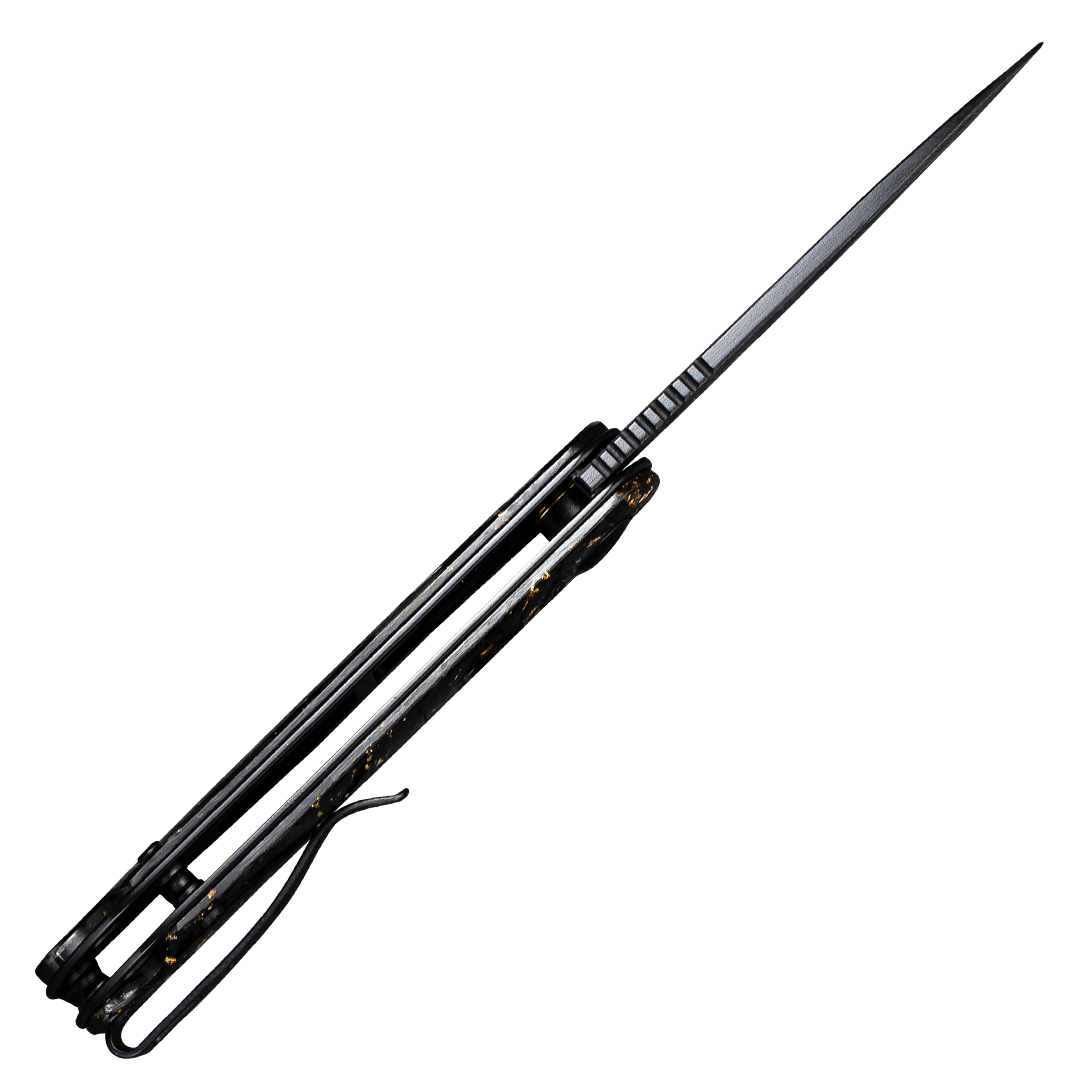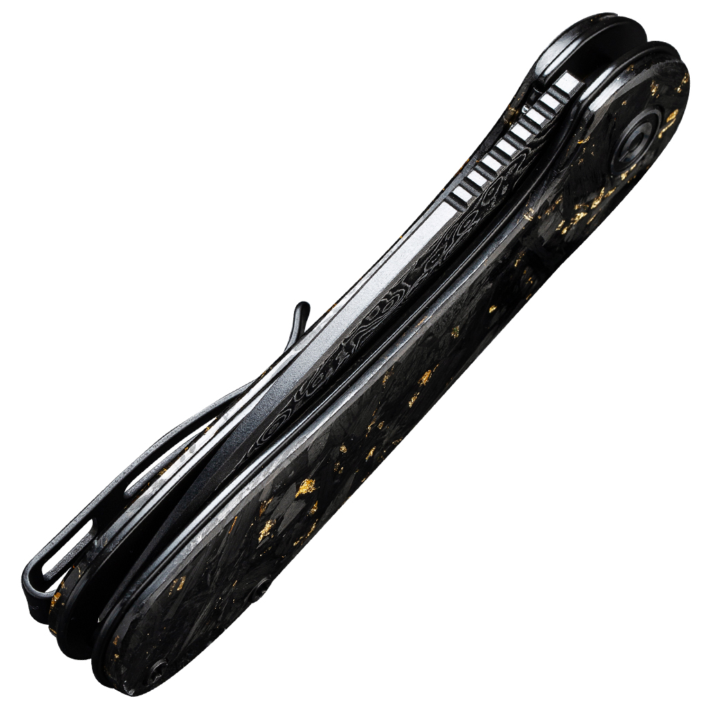 Rękojeść Civivi Elementum wykonano z połączenia włókna węglowego z płatkami złota zatopionymi w przezroczystej żywicy. Mieszanka jest lekka i niepodatna na uszkodzenia mechaniczne. Chropowata faktura okładzin sprawia, że nóż dobrze leży nawet w spoconej dłoni.
