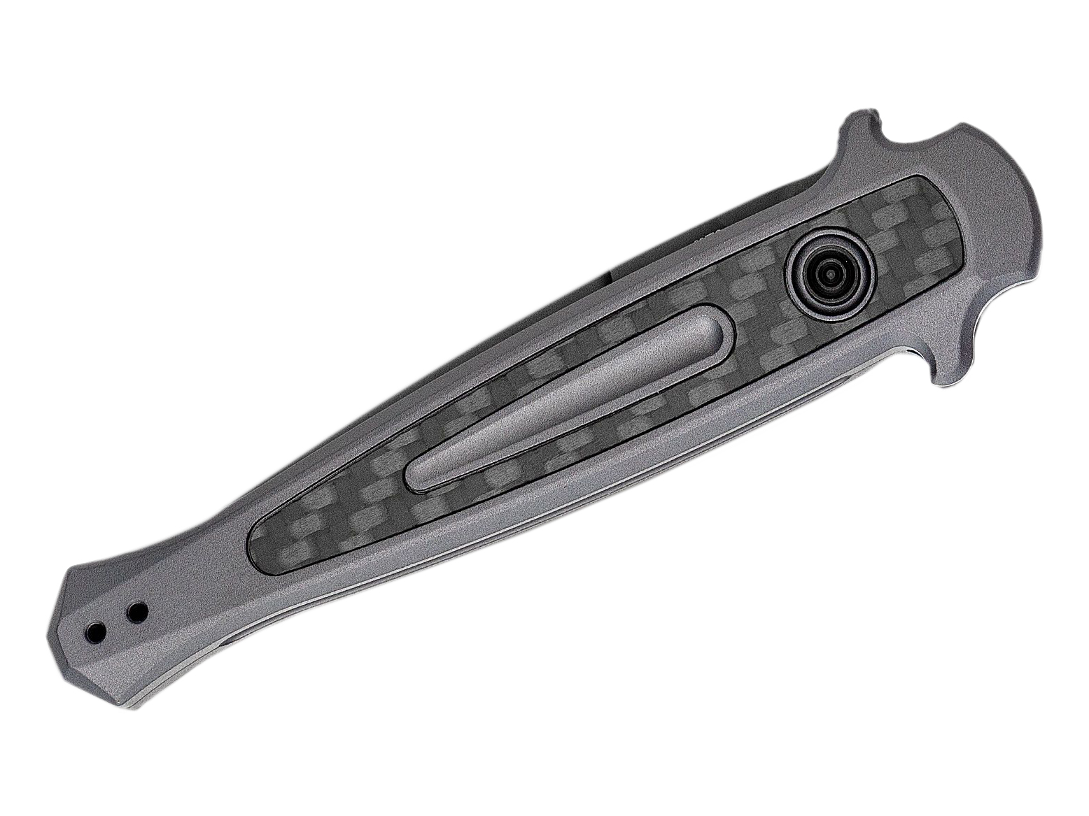Nóż ma opływowe okładziny z anodowanego aluminium lotniczego 6061-T6, wyposażone w obustronny jelec. Elementem, który nadaje nożowi eleganckiego stylu, jest ozdobna wkładka z włókna węglowego o mieniącej się fakturze.