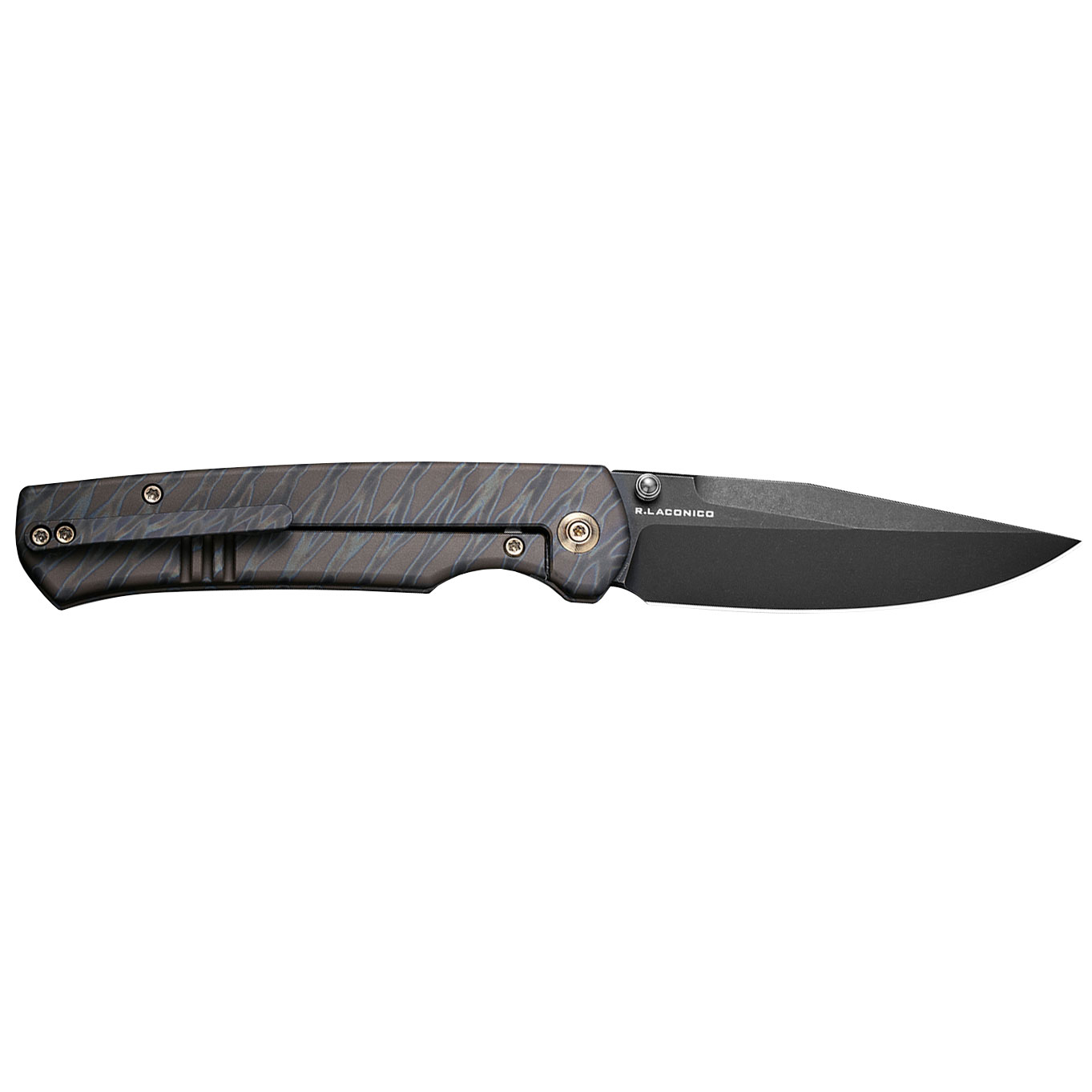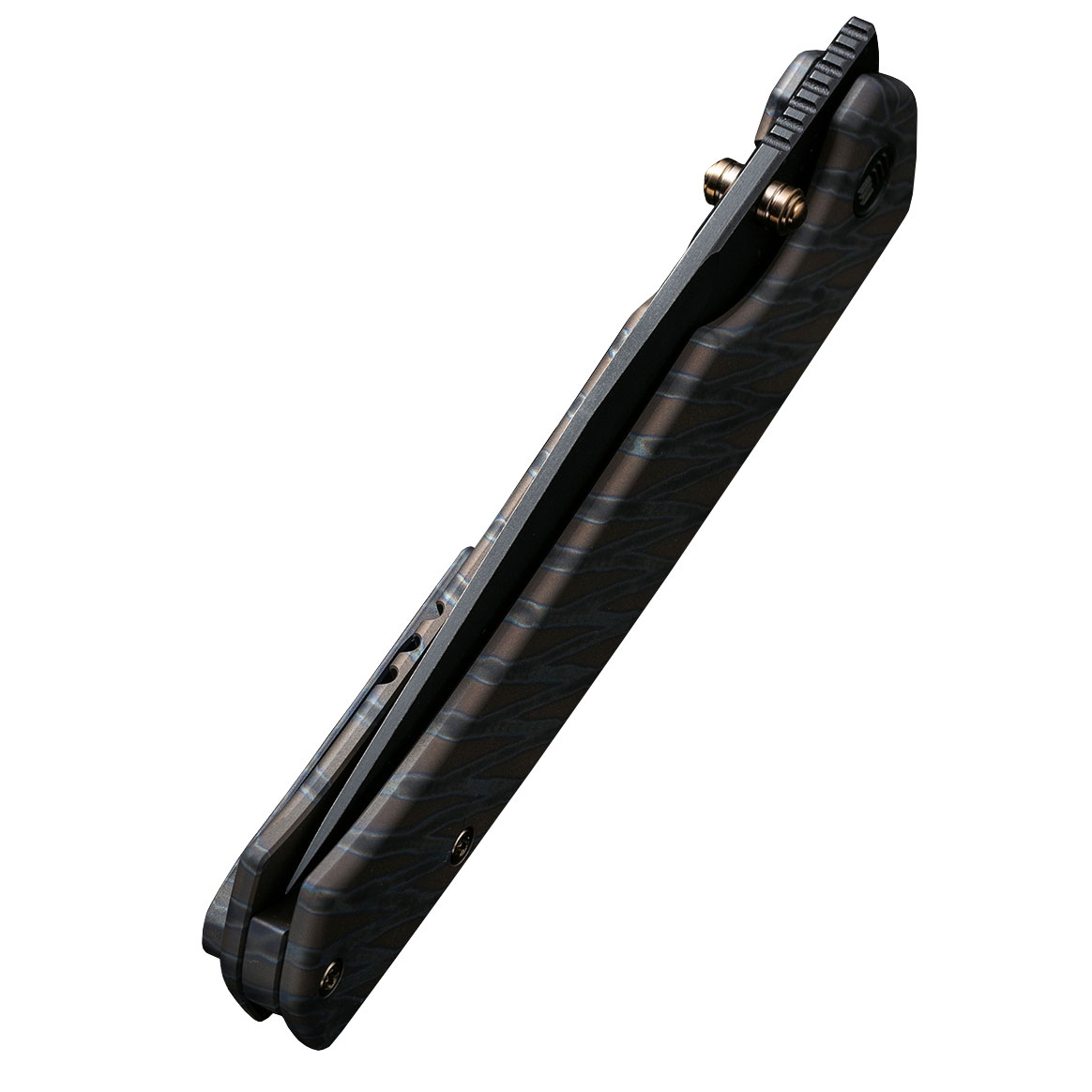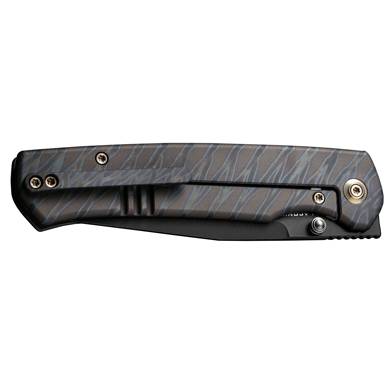 Klingę foldera wykuto ze stali CPM-20CV, zapewniającej znakomitą trwałość i odporność na korozję. Głownię typu Clip Point, zahartowaną do 58-60 HRC, otwieraną za pomocą flippera lub kołka pod kciuk, wykończono metodą Black Stonewash. Rękojeść wykonano z tytanu pomalowanego w charakterystyczny wzór – pamiętający wojnę w Wietnamie kamuflaż Tiger Stripe. Całość blokuje sprawdzony mechanizm Frame Lock.