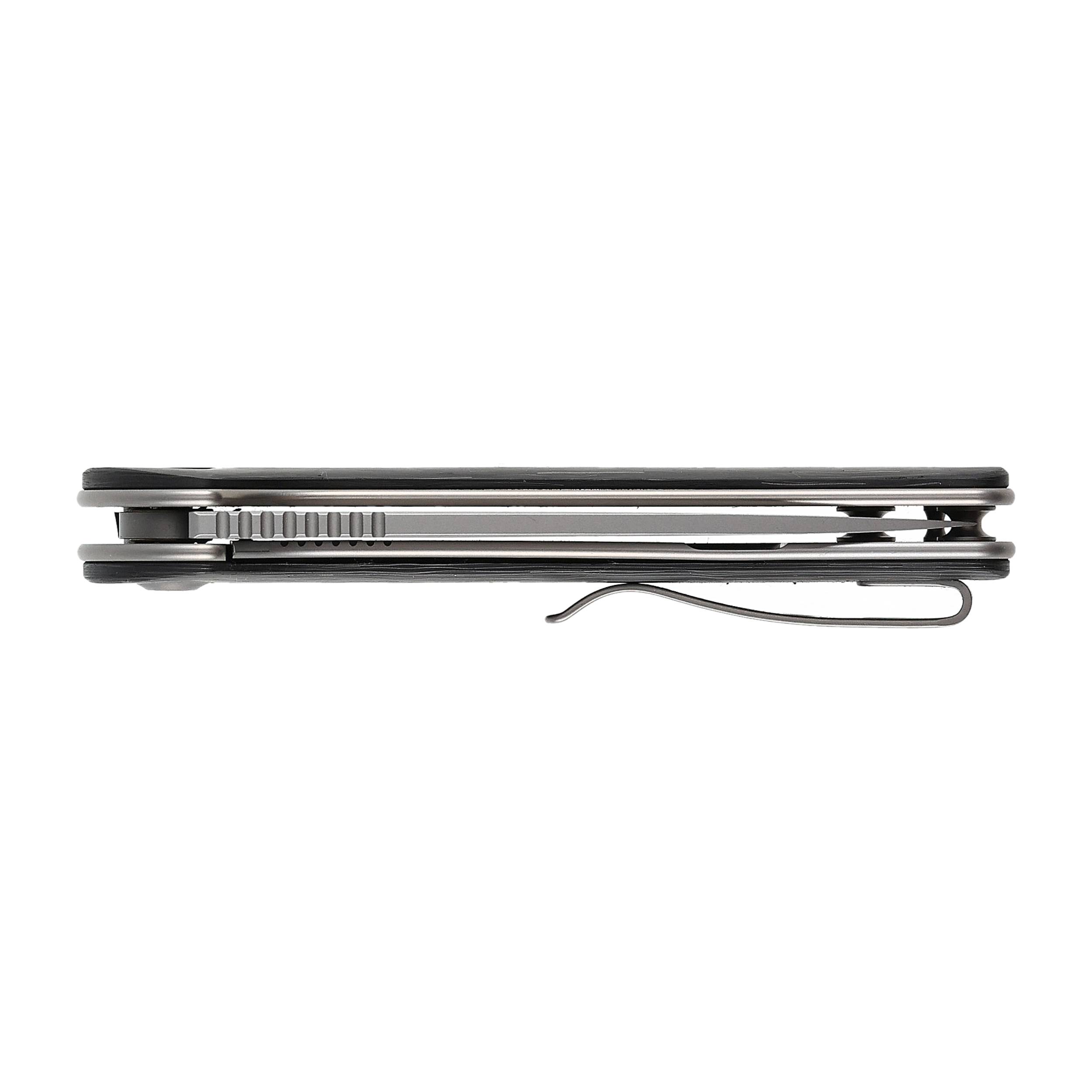 Dzięki jednostronnemu tytanowemu klipsowi WE Saakshi można wygodnie przenosić w kieszeni spodni lub plecaka.