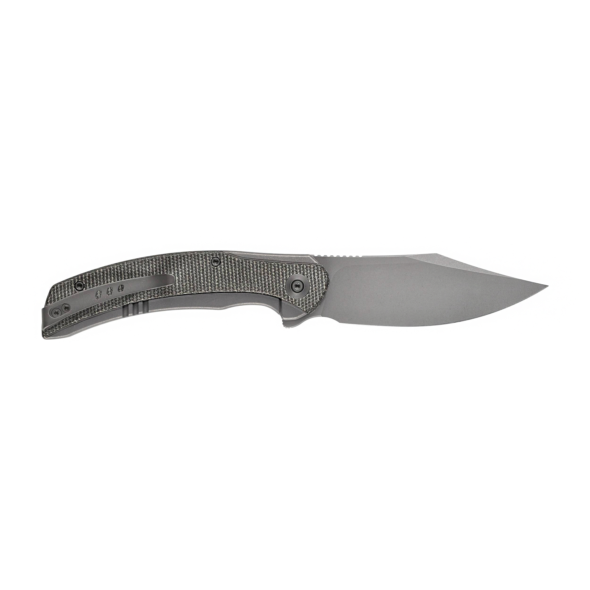 Rękojeść wykonano z połączenia micarty oraz tytanu, metalu lekkiego i niepodatnego na uszkodzenia mechaniczne. Wygładzone krawędzie okładzin poprawiają pewność uchwytu i sprawiają, że narzędzie dobrze leży w dłoni. Producent zadbał również o wygodny transport noża, wyposażając go w obustronny, tytanowy klips.