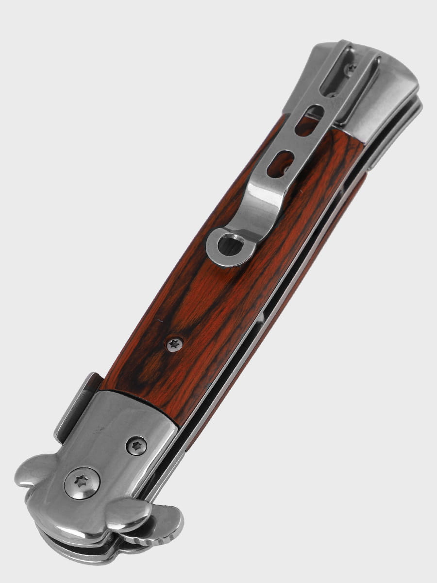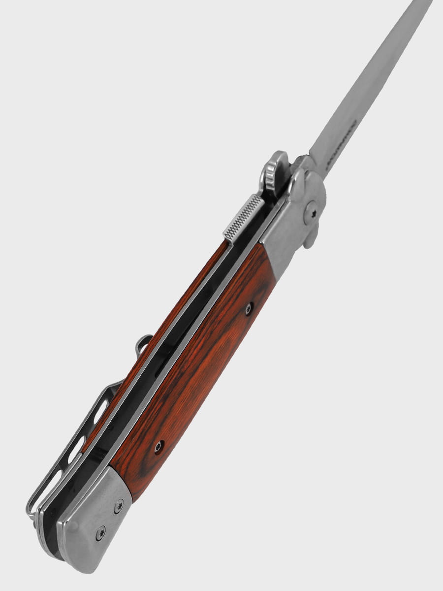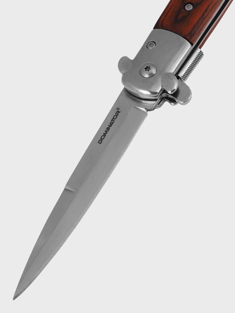 Nóż Składany Sycylijka Sztylet marki DOMINATOR®. Marka DOMINATOR® zapewnia bardzo wysoką jakość wykonania opartą o specyfikację militarną, solidne materiały oraz zaawansowane technologie. Nóż swoją stylistyką przypomina klasyczne, składane noże włoskie. Posiada wysokiej jakości ostrze wykonane ze stali nierdzewnej 440, które idealnie współgra z drewnianą okładziną rękojeści. Konstrukcja jest wytrzymała i wykonana z dbałością o szczegóły. Stabilna blokada Liner Lock pozwala uniknąć przypadkowego zamknięcia noża.
