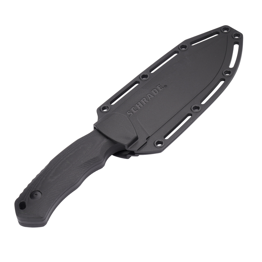 Specjalne antypoślizgowe okładziny wykonane są z polimeru G10 i posiadają fakturę stylizowaną na drewno. Dzięki temu pewnie trzymają się nawet spoconej i zabrudzonej dłoni. U spodu posiada otwór do przewleczenia paracordu. W zestawie znajduje się pochwa z twardego polimeru, z uchwytem na pas i własnymi otworami na paski i sznurki.