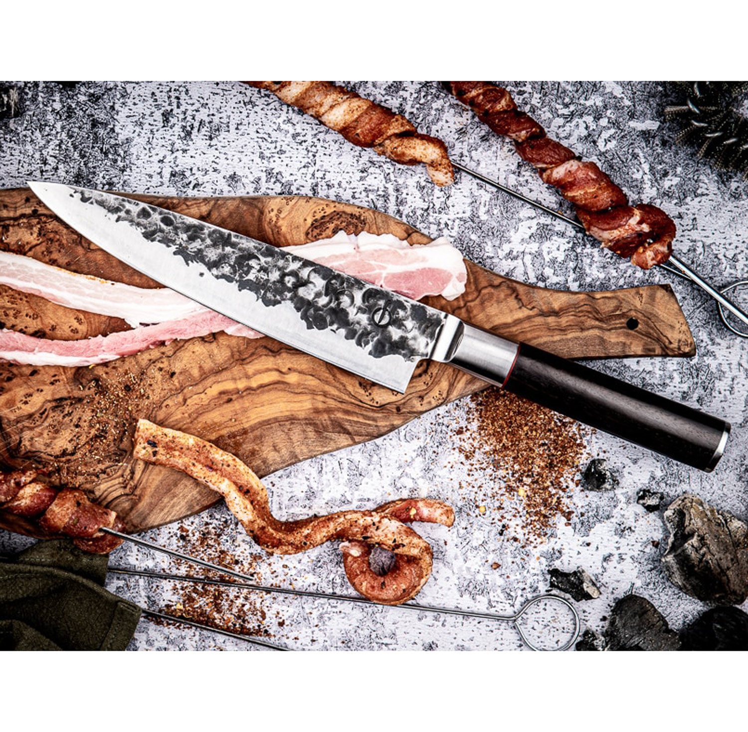 Pełnowymiarowy nóż szefa kuchni sprawdzi się wszędzie tam, gdzie praca wre - ta przeznaczona do wszelkiego rodzaju siekania konstrukcja sprawdzi się zarówno w szybkim przygotowaniu mięsa na gulasz jak i podczas intensywnego rozdrabniania pietruszki na chimichurri. Dzięki wydatnemu brzuchowi krawędzi tnącej operowanie nożem jest niezwykle łatwe i precyzyjne, a relatywnie długa głownia poradzi sobie również z filetowaniem dużych ryb czy wykrawaniem masywnych steków. Zastosowanie japońskiej stali nierdzewnej zapewniającej wysoką odporność na korozję połączoną z niezwykle łatwym ostrzeniem, co z kolei gwarantuje niezawodną i przyjemną eksploatację. Konstrukcję dopełnia przyjemne wzornictwo łączące surową powierzchnię głowni z elegancką, drewnianą rękojeścią.
