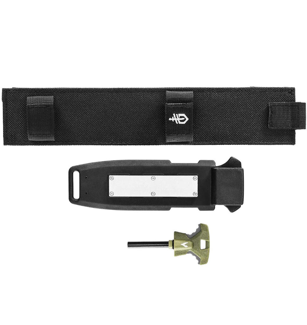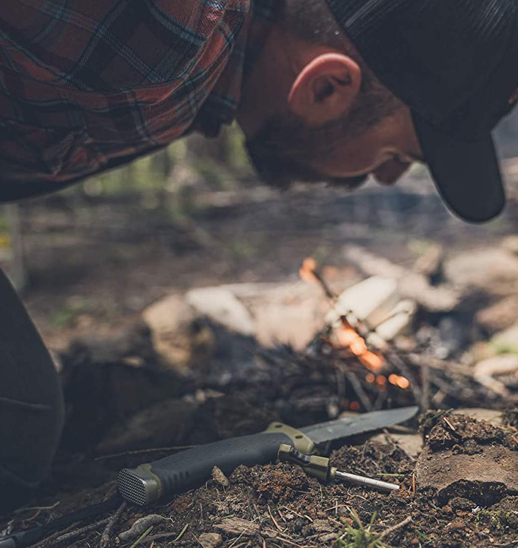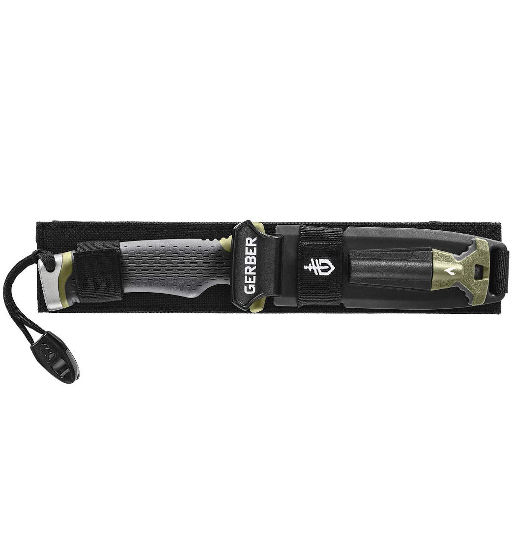 Nóż Gerber Ultimate Survival posiada wszystko aby przetrwać samotnie w dżungli. Stałe ostrze w połowie ząbkowane pomoże piłować grube gałęzie, dzięki stalowej głowicy młotkowej można rączką dobijać nawet gwoździe. Pochwa umożliwia komfortowe zamocowanie noża do paska spodni, zawiera osełkę wbudowanę w pochwę, gwizdek alarmowy oraz pręt ferrytowy (krzesiwo) dzięki, któremu rozpalisz ogień bez zapałek. Najważniejsze funkcje i elementy noża: