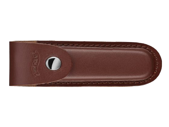 Do noszenia noża służy skórzane etui z szeroką szlufką na pas oraz zapięciem na napę.