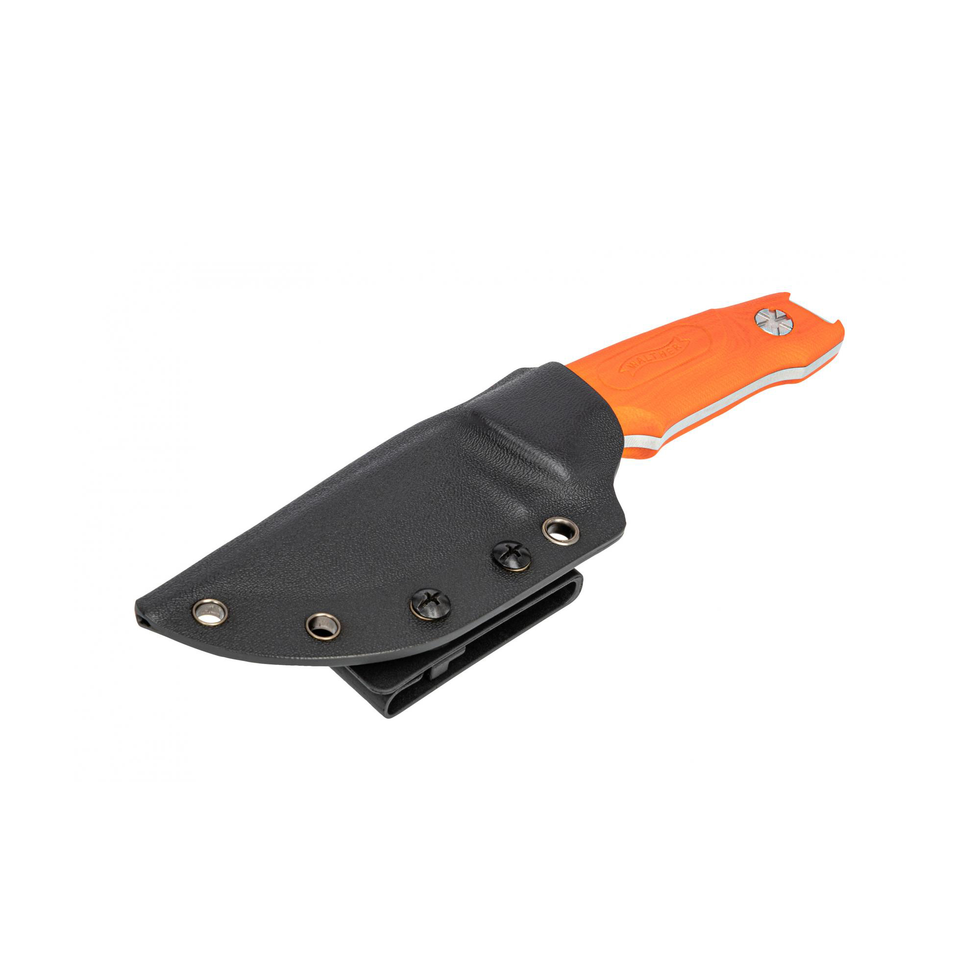 Chwyt noża Walther HBF 1 wykonany został z niezwykle trwałego a przy tym higienicznego kompozytu G10. Materiał ten bazuje na tkaninie z włókna szklanego sprasowanej przy pomocy żywicy i charakteryzuje się ekstremalną wytrzymałością. Kontrastowy kolor zastosowanego tworzywa sprawia, że nóż myśliwski HBF 1 jest niezwykle łatwy w odnalezieniu po upadku w ściółkę lub trawę. Odpowiedni profil chwytu sprawia natomiast, że model jest niezwykle wygodny oraz bezpieczny w użytkowaniu. Dzięki zastosowaniu kydexowej pochewki nóż jest niezwykle łatwy w dobyciu. Nie musimy ponadto obawiać się o jej kondycję umieszczając w niej ubrudzone narzędzie - syntetyczna konstrukcja jest bardzo łatwa w czyszczeniu.