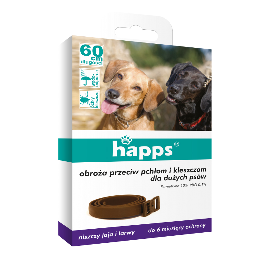 Obroża Happs przeciw pchłom i kleszczom dla małych psów zapewnia skuteczną i długotrwałą ochronę przez groźnymi kleszczami i pchłami.