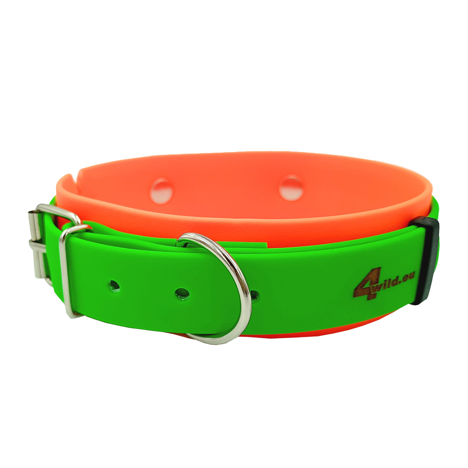 Obroża wodoodporna 4wild została wykonana z taśmy BioThane. Jest to materiał którego trzon stanowi taśma poliestrowa otoczona PVC. Obroża ma aż 38 mm szerokości i jest wyposażona obrotowy krętlik ułatwiający prowadzenie nawet tych bardziej aktywnych psów.