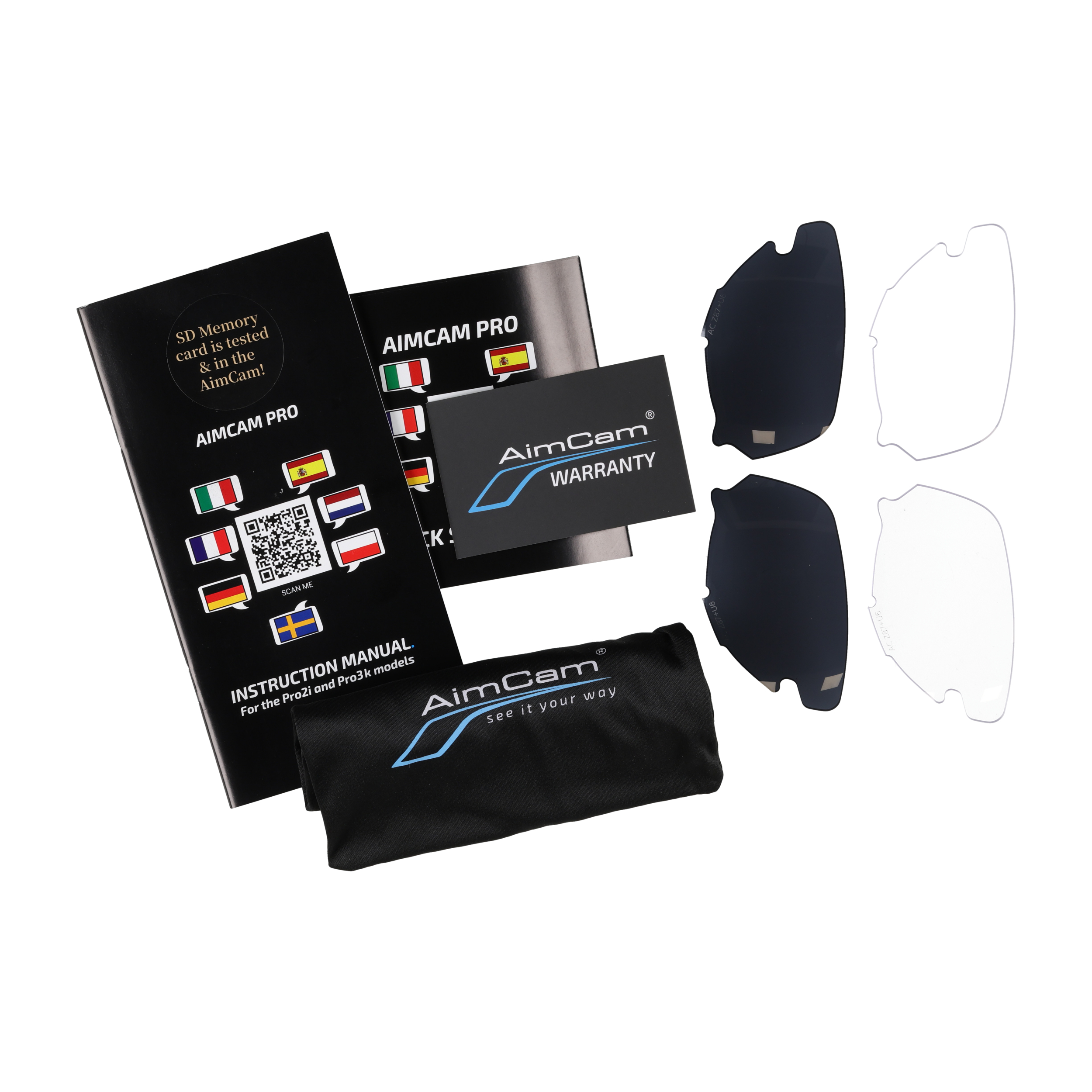Atestowane soczewki z poliwęglanu: soczewki wykonane są z 2 mm poliwęglanu, posiadające odporność na uderzenia z dużą prędkością — zgodnie z normą ANSI Z87+. Dla tych, którzy potrzebują pełnej ochrony oczu, istnieje opcja uszczelniaczy ACFULLSEAL, które zmieniają AimCam Pro 3K w gogle ochronne.