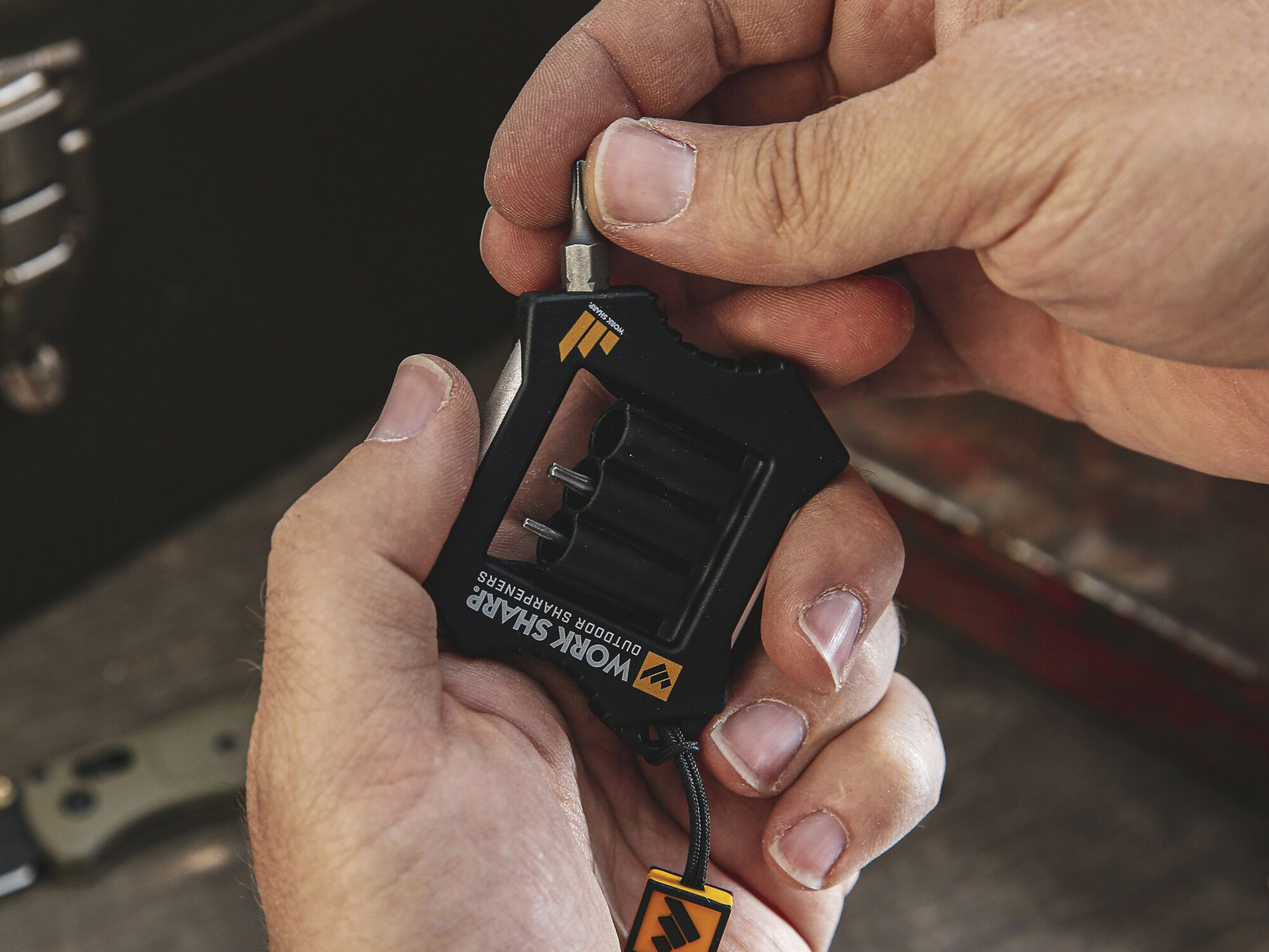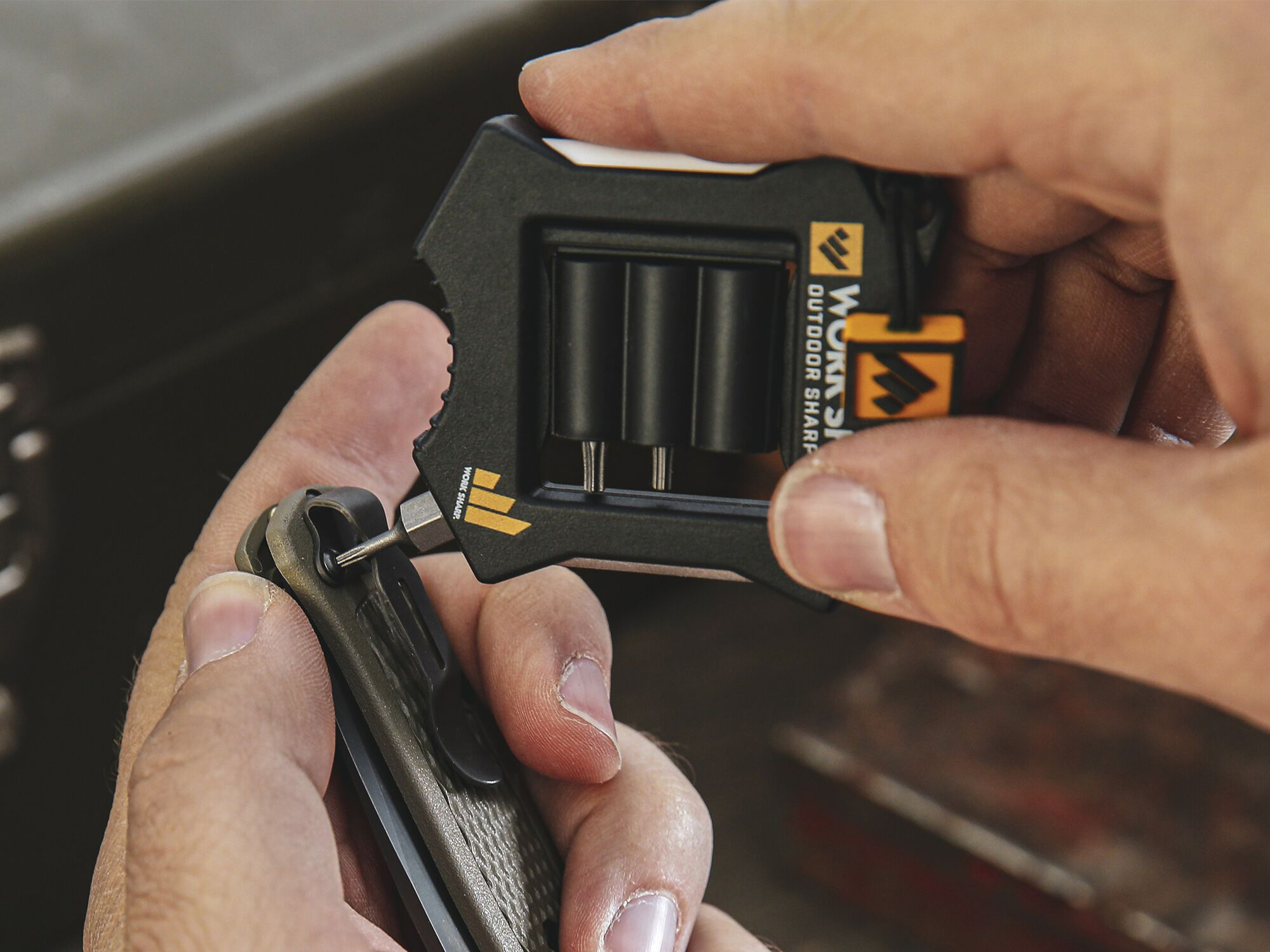 Zamocowana do osełki zawieszka z logo Work Sharp ułatwia wyjmowanie z kieszeni lub torby.