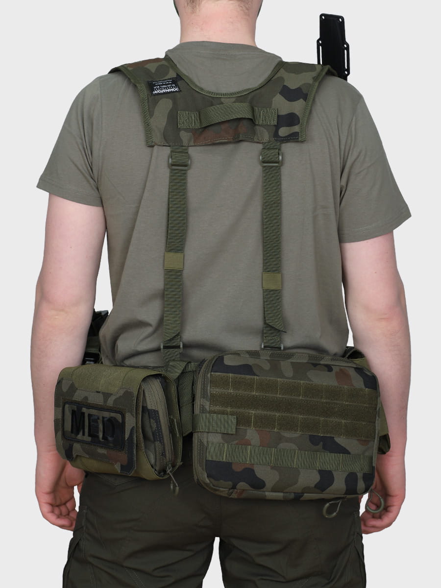 Pas wewnętrzny mocowany za pomocą rzepa zapewnia stabilność oraz wygodę noszenia nawet podczas intensywnych aktywności. Wygodne naramienniki oraz regulowana długość szelek pozwalają na odpowiednie dopasowanie pasa do sylwetki użytkownika minimalizując niewygodę i zmęczenie.