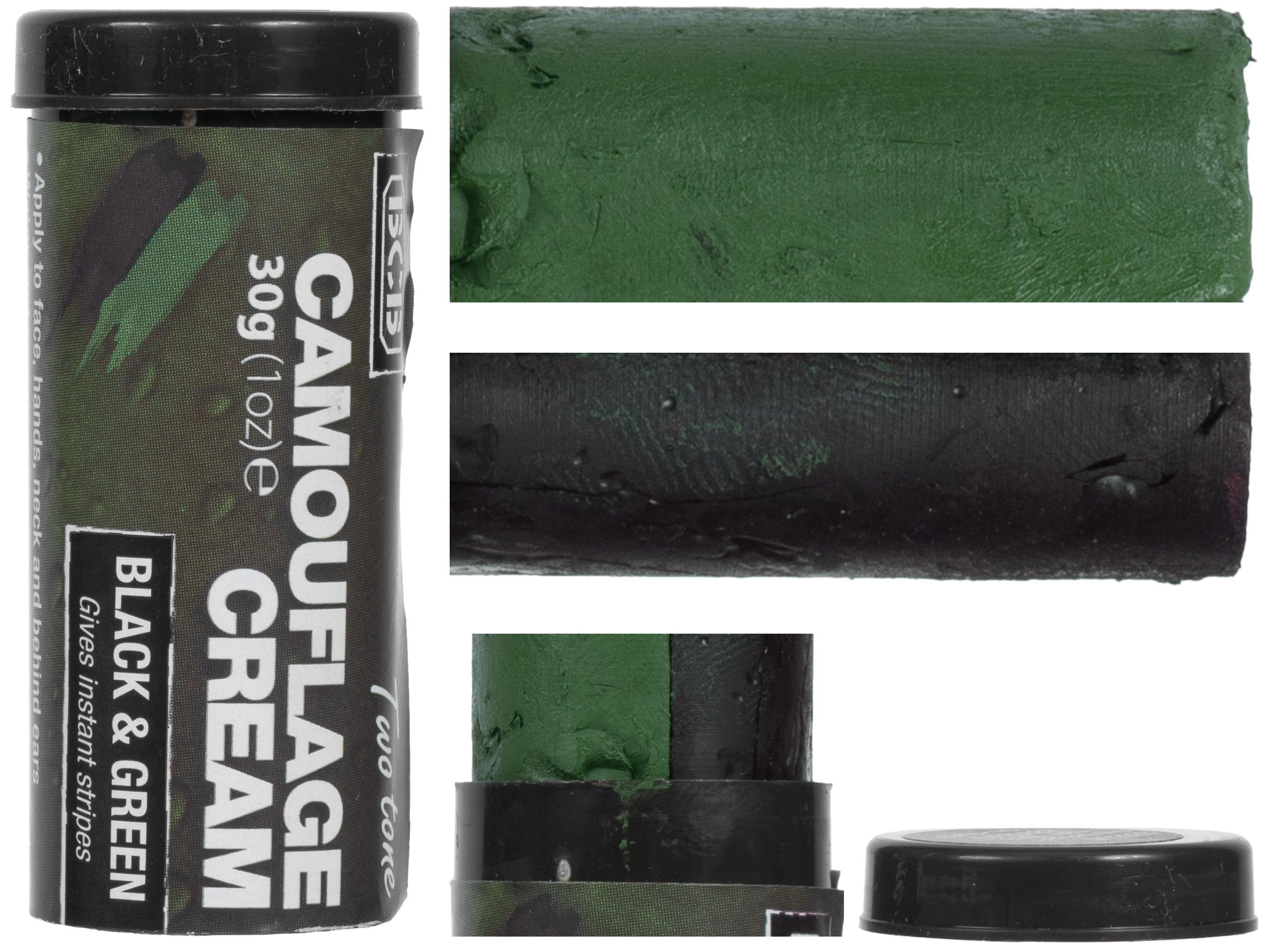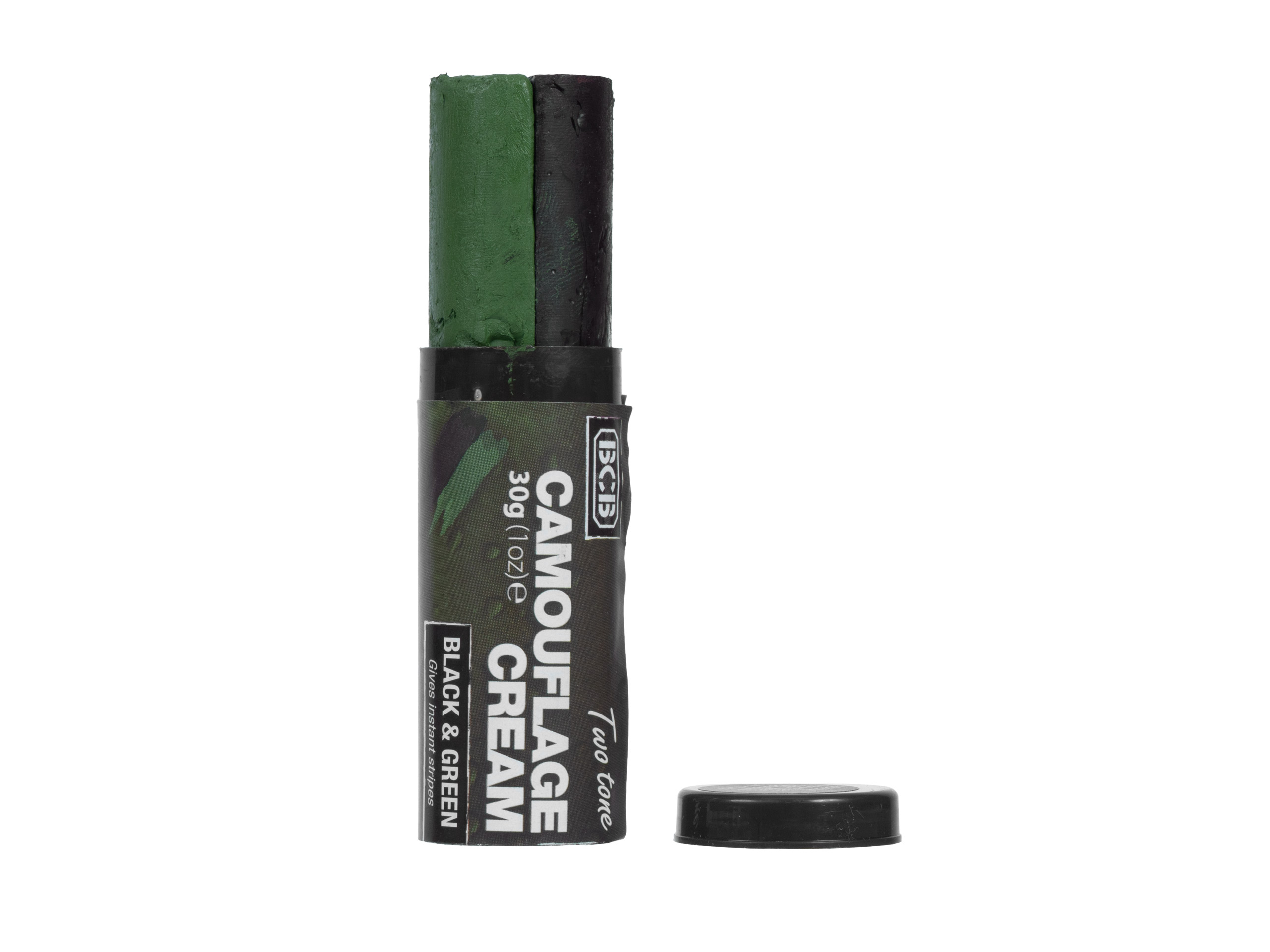 Sztyft zawiera farby w kolorach czarnym i zielonym pozwalające na wykonanie skutecznego kamuflażu podczas rozgrywki asg, paintballa lub gier terenowych.