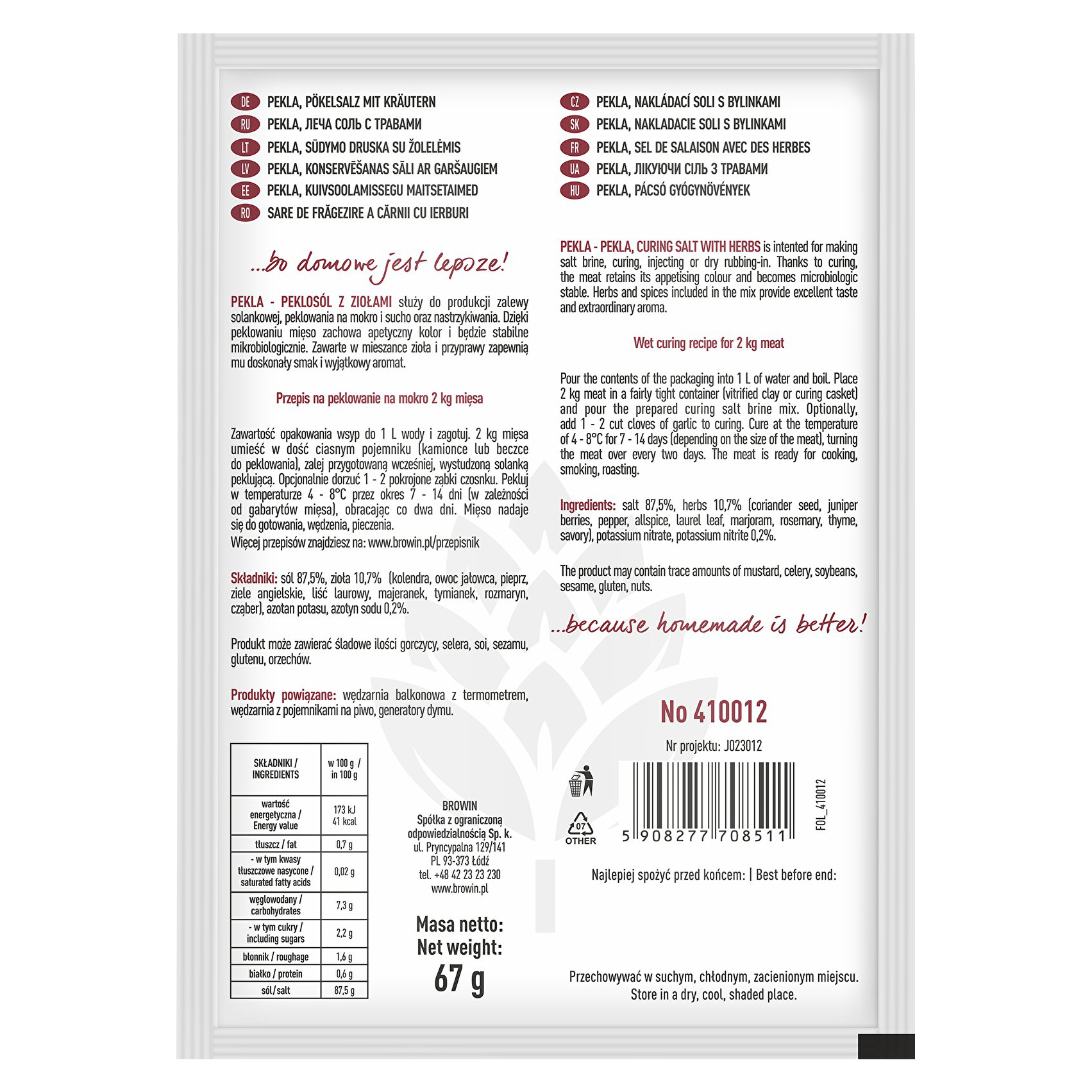 Peklosól Browin to ziołowa pekla, dzięki której przygotujesz zalewy do peklowania, nastrzykiwania oraz nacierania na mokro lub sucho domowych wędlin i mięs.