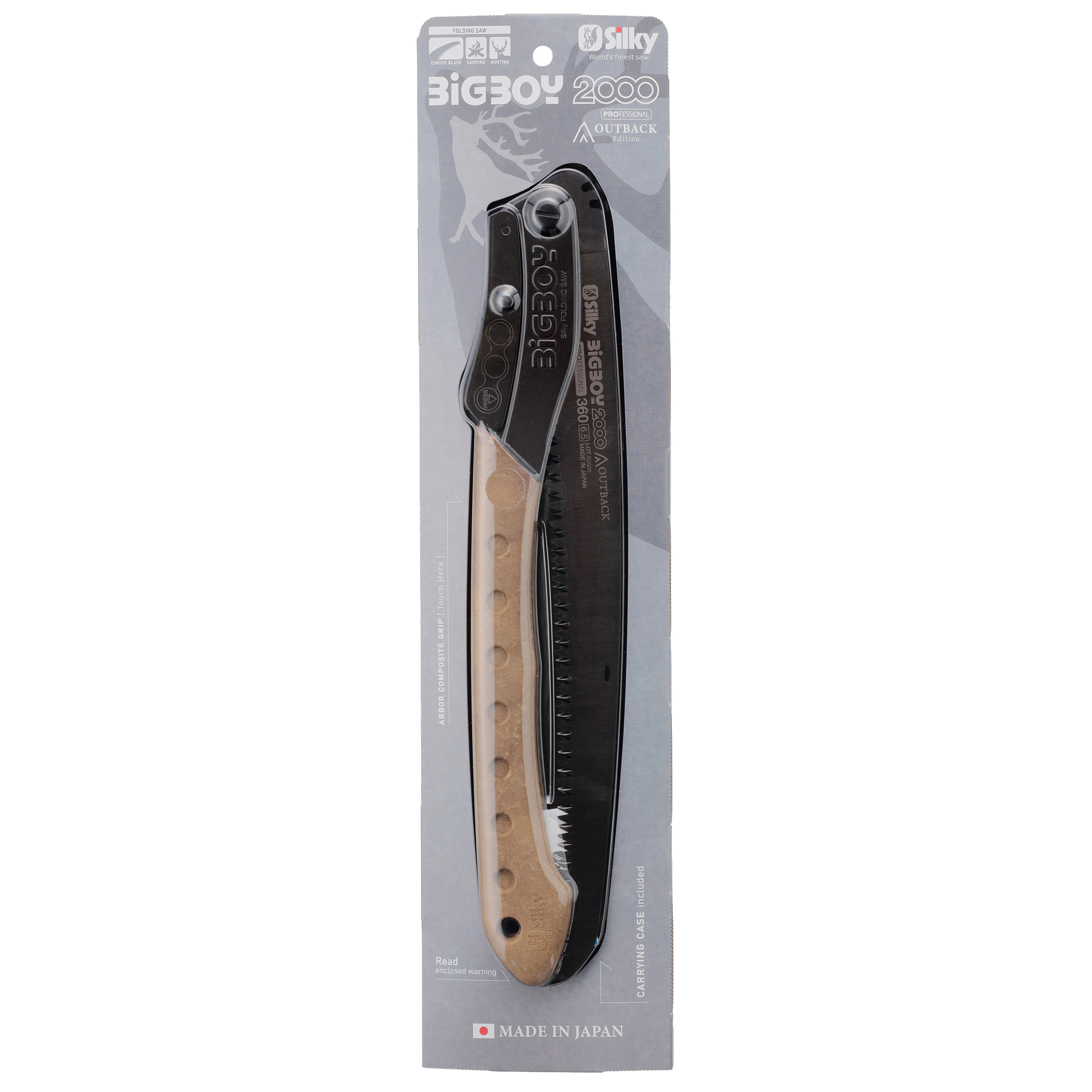 Piły outdoorowe są używane przez cały rok, także w okresie zimowym lub w warunkach o dużej wilgotności. Dlatego do budowy rękojeści zastosowano specjalne tworzywo Arbor. Laminat łączy cechy drewna i polimeru, dzięki czemu pozostaje przyjemnie ciepły nawet w niskiej temperaturze, a jego szorstka faktura zapewnia pewny chwyt i dobrą kontrolę nad piłą. Bezpieczeństwo pracy zapewnia grzbietowa blokada, która zabezpiecza brzeszczot po rozłożeniu i złożeniu. Piła jest składana w taki sposób, że ostre zęby są całkowicie chowane w rękojeści. Pozwala to na jej bezpieczne przenoszenie w plecaku lub torbie myśliwskiej. W zestawie zasuwany pokrowiec z nylonu. Otwór w rękojeści daje możliwość zamocowania karabińczyka lub linki zabezpieczającej.