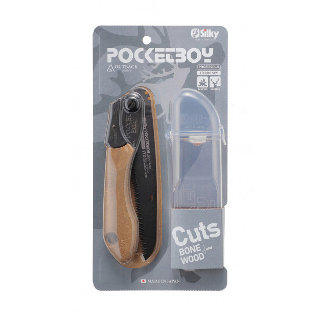 Silky Pocketboy Outback Edition ma brzeszczot o długości 170 mm z szerokim ząbkowaniem (10 zębów na 30 mm długości brzeszczota), który idealnie sprawdzi się do cięcia świeżego i suchego drewna oraz kości.