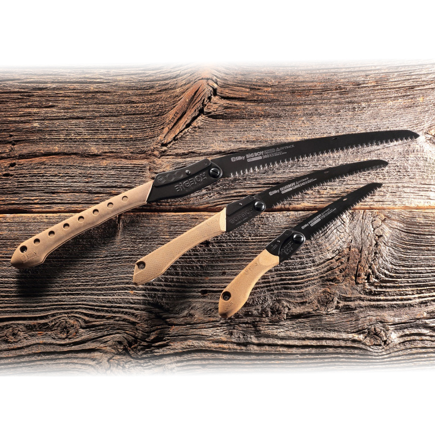 Z uwagi na fakt, że piły są często wykorzystywane w zimnych i wilgotnych warunkach, do budowy rękojeści zastosowano tworzywa Arbor. Laminat łączy cechy drewna i polimeru, dzięki czemu pozostaje przyjemnie ciepły nawet w niskiej temperaturze, a jego szorstka faktura zapewnia wygodny chwyt i doskonałą kontrolę.
