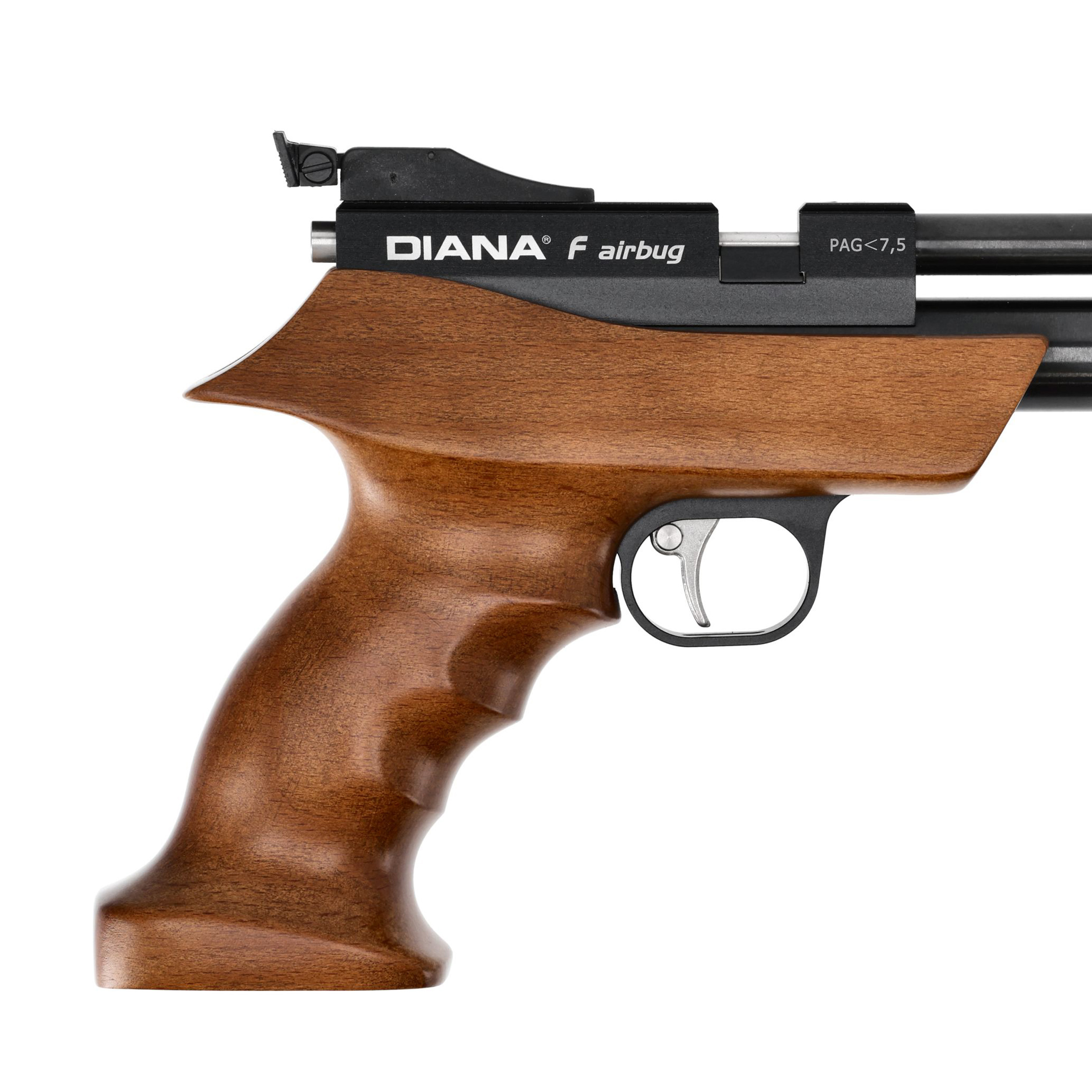 Diana Airbug 4,5 mm ma klasyczną drewnianą osadę, bruzdowaną stalową lufę, mechaniczne przyrządy celownicze oraz szynę 11 mm do montażu celownika optoelektronicznego. Sportowy charakter wiatrówki podkreśla jej ergonomiczny chwyt z wycięciami na palce oraz półką. Dzięki takiej funkcjonalności wiatrówka zapewnia stabilny chwyt podczas strzelania z jednej ręki. Pistolet Airbug 4,5 mm zasilany jest 12 g kapsułą CO2 montowaną w metalowej tubie pod lufą. Z jednej kapsuły możemy oddać ponad 40 strzałów o równej prędkości początkowej ok. 160 m/s. Gazowy napęd CO2 sprawia, że wiatrówka po oddaniu strzału nie generuje żadnego odrzutu, co wpływa na komfort i precyję strzelania. W pistolecie zastosowano bruzdowaną lufę o długości aż 210 mm, co ma znaczący wpływ na celność i powtarzalność strzałów. Nad bezpieczeństwem czuwa przetykowy bezpiecznik znajdujący się nad spustem w zasięgu palca.