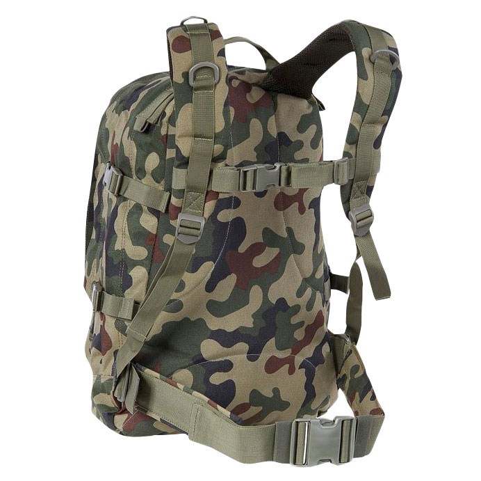 Przednia kieszeń wyposażona została w system MOLLE, do którego bez problemu możemy doczepić dodatkową kieszeń, panel velcro czy pokrowiec z termosem. W przypadku, gdy zabraliśmy ze sobą bukłak, dwa otwory zamykane rzepem przeznaczone są do przekierowania rurek od pojemnika z napojem. Dla bezpieczeństwa plecak został zaopatrzenia w regulowane boczne taśmy mocującegco, wytrzymałe szelki oraz pas biodrowy.