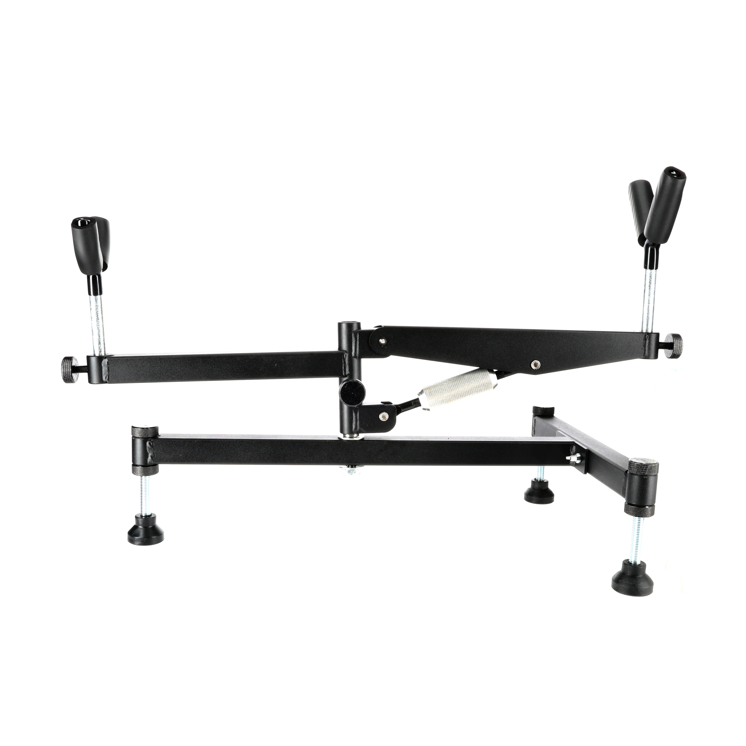 Stojak ma ciężką konstrukcję wykonaną ze stalowych profili, co zapewnia odpowiednią stabilność i sztywność podczas oddawania strzału z broni dużego kalibru. Ramię stojaka można regulować w pionie. Do mocowania broni zastosowano metalowe widełki ze zabezpieczającymi nakładkami. Rozwiązania te pozwalają na stabilne osadzenia broni na stojaku bez ryzyka jej zarysowania. Wysokość ramienia oraz uchwytów na broń można precyzyjnie regulować za pomocą pokręteł bez konieczności używania narzędzi. Powiększone pokrętła są wygodne w użytkowaniu i umożliwiają ich obsługę także w rękawicach.