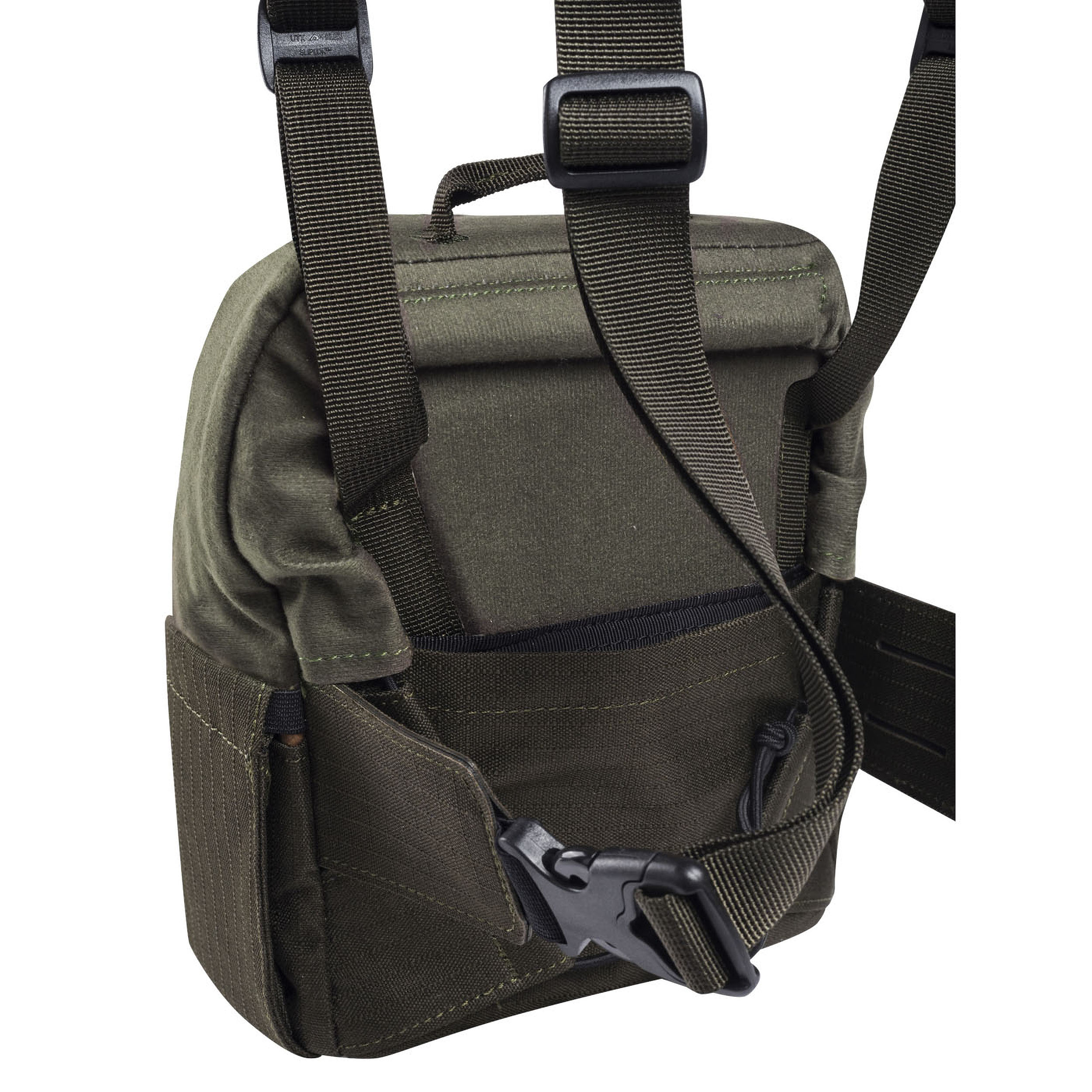 Zastosowany materiał znacząco ogranicza poziom generowanego podczas ruchu hałasu, co czyni go doskonałym akcesorium do polowań. Wewnętrzne powierzchnie uprzęży są wyściełane, co skutecznie odprowadzającą wilgoć, i zapewnia komfort nawet podczas wielogodzinnego użytkowania. Szeroka powierzchnia szelek i możliwość dopasowania rozmiarów gwarantują wygodę osobom o zróżnicowanych typach sylwetki. Usytuowane na bokach zapinane ładownice oraz umieszczony na zewnątrz głównego przedziału panel MOLLE pozwalają na wygodne przenoszenie akcesoriów.