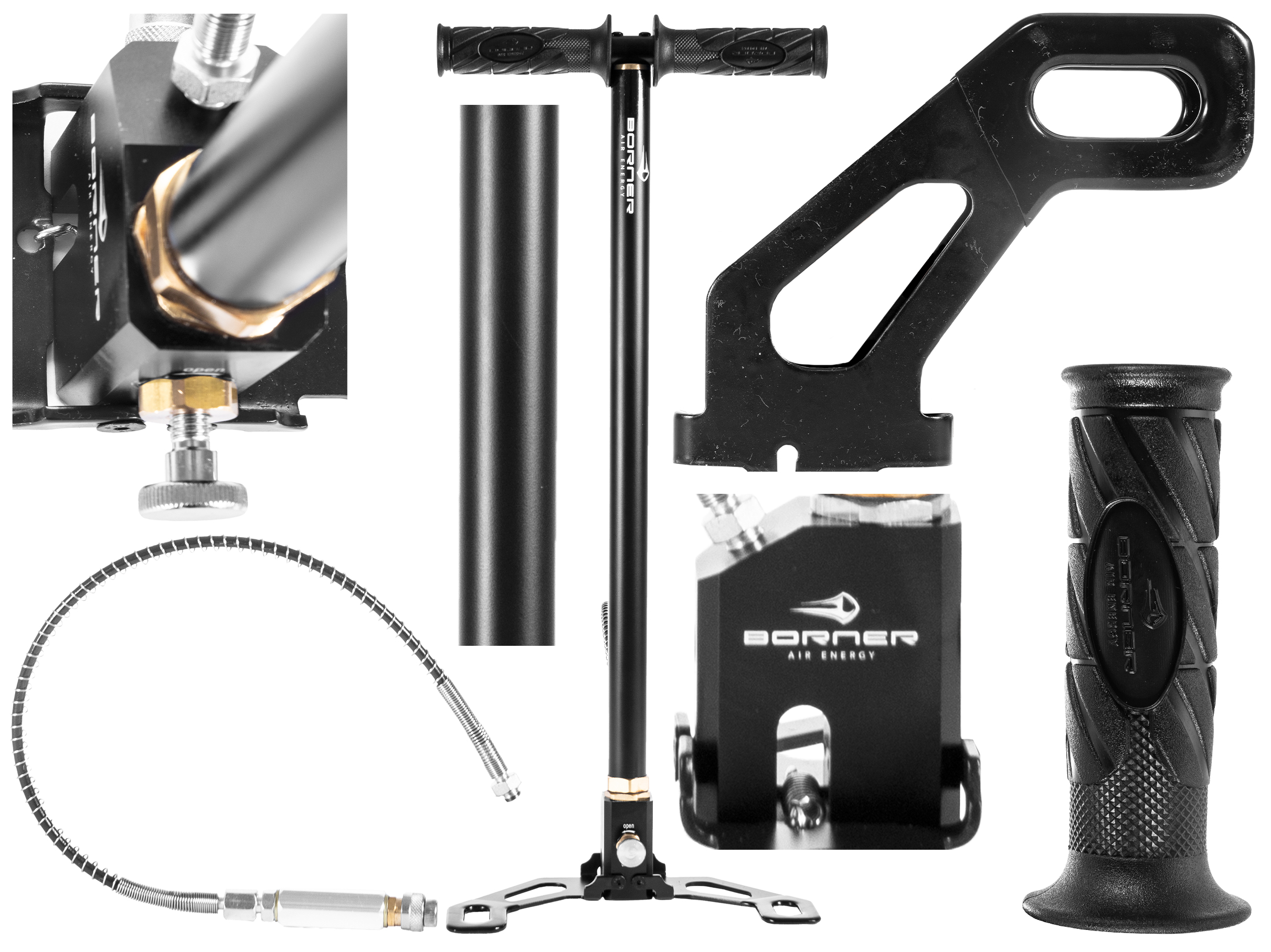 Pompka PCP Borner ze składaną podstawą to wysokociśnieniowa pompka, dzięki której możemy samodzielnie napełnić kartusz wiatrówki sprężonym powietrzem. Pompka wyposażona w czytelny manometr oraz składaną podstawę.
