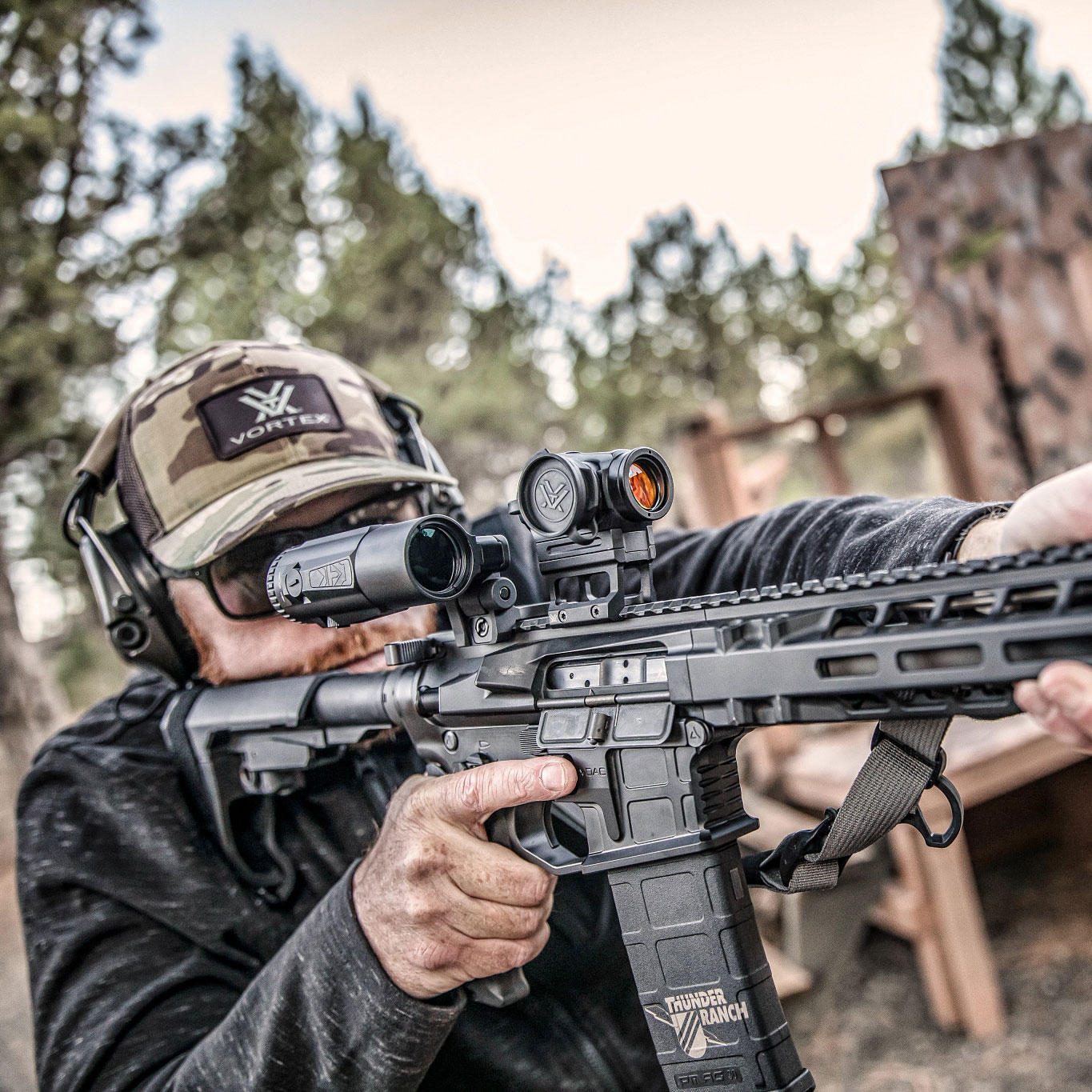 Vortex Micro6x to kompaktowy powiększalnik o 6× powiększeniu, który umożliwia na błyskawiczne przystosowanie karabinka do strzelania na większym dystansie. Vortex Micro6x jest kompatybilny z celownikami kolimatorowymi i holograficznymi.