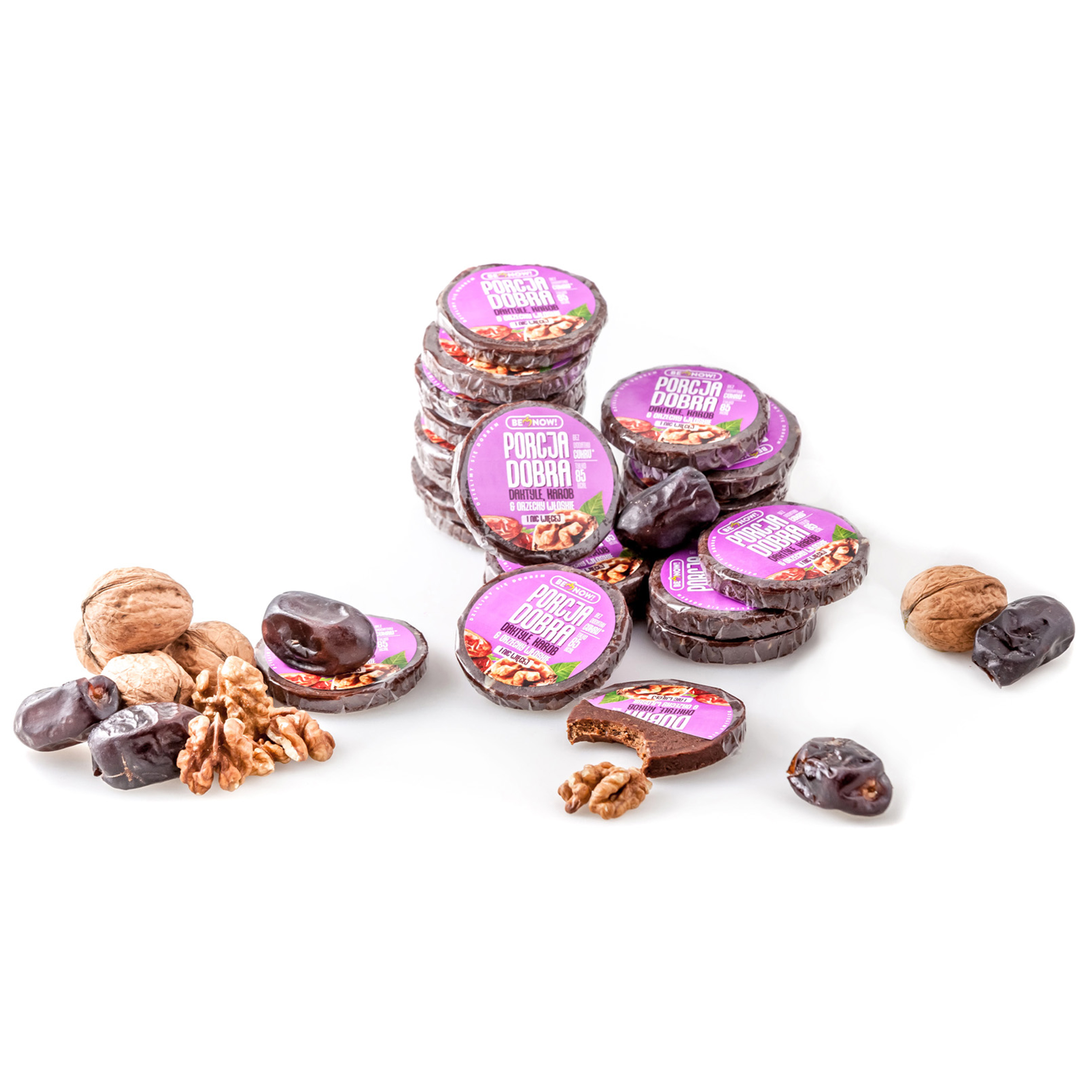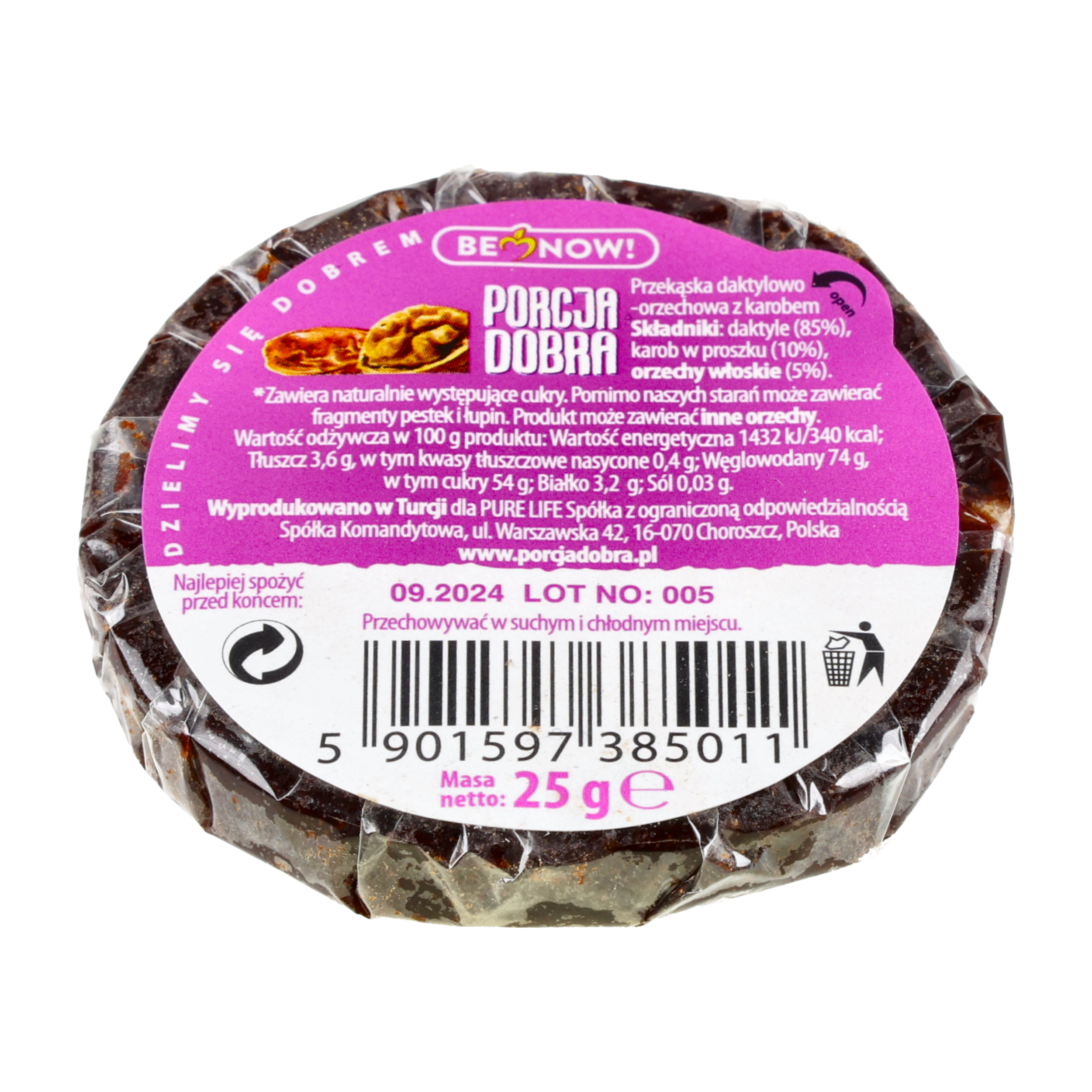 Przekąska Porcja Dobra o smaku daktylowo-orzechowym to przekąska z dodatkiem karobu (alternatywa dla kakao), mała zabawka (jedna z kilku do kolekcjonowania) oraz kolorowa karta, którą również można kolekcjonować.