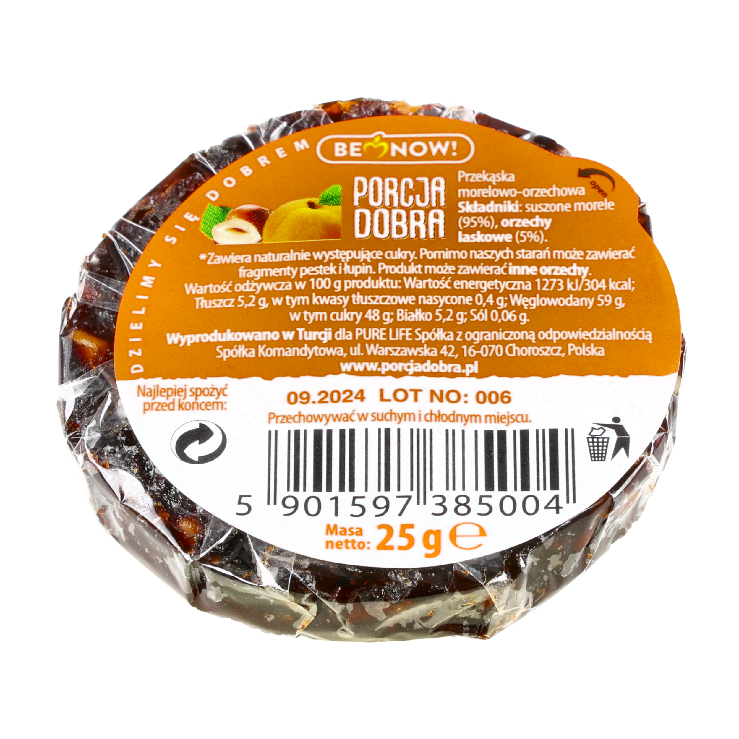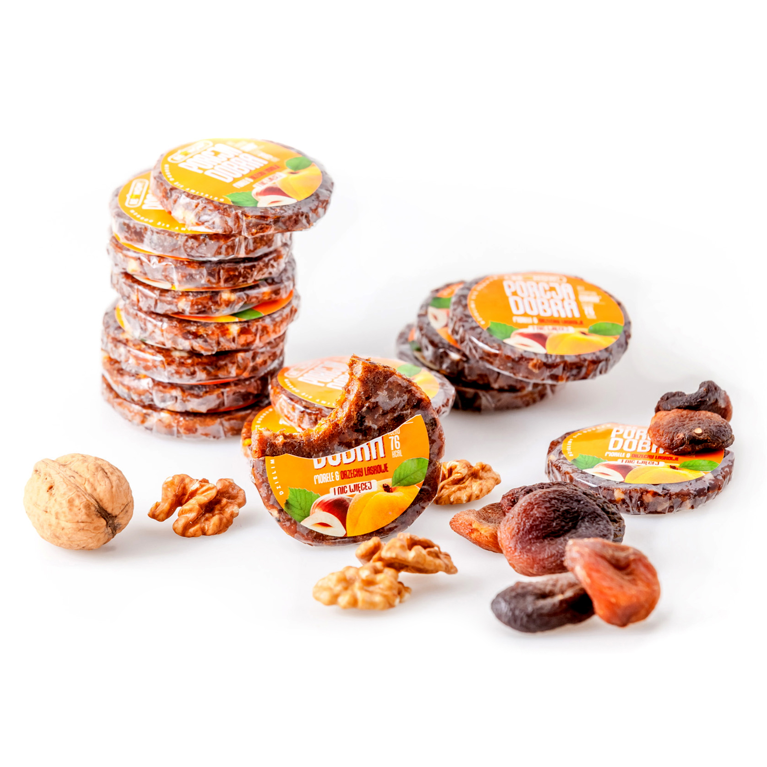Przekąska Porcja Dobra w formie krążka zrobiona jest z prasowanego miksu suszonych owoców i świeższych, posiekanych orzechów. To pyszna i zdrowa przekąska, która stanowi świetną alternatywę dla przekąsek tradycyjnych.
