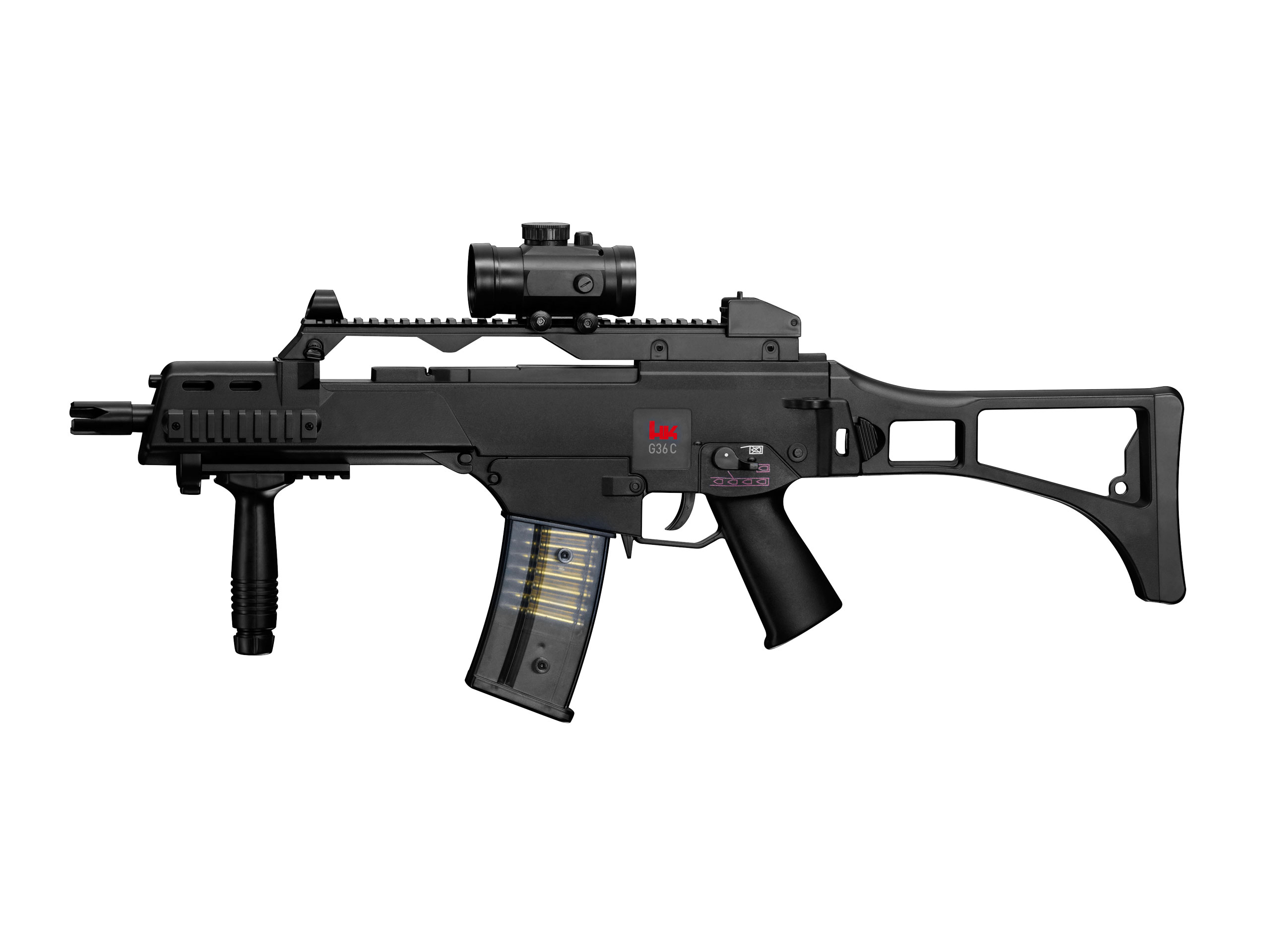 H&K G36C to elektryczna replika asg, przeznaczona dla początkujących graczy wyposażona w celownik kolimatorowy, chwyt przedni oraz atrapę tłumika dźwięku.