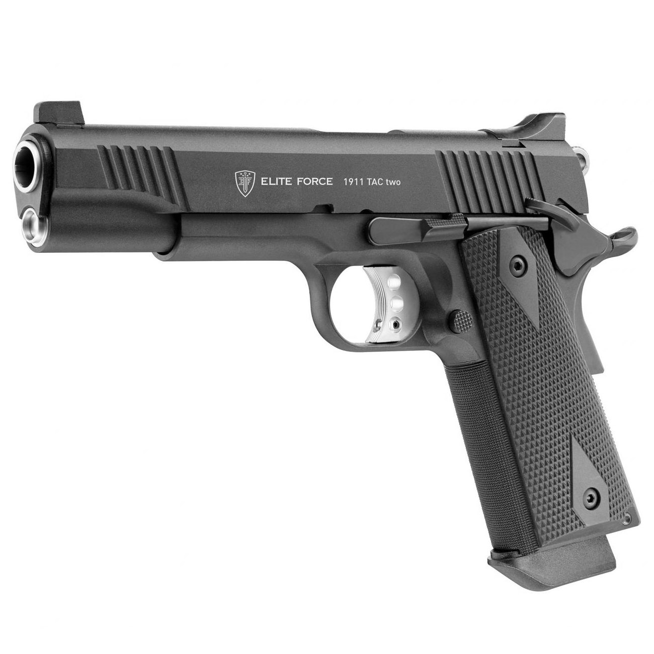Elite Force 1911 Tac Two jest zasilana mieszanką green gas. Sprężony propan miota kulki 0,20 g z energią 1 J i odpowiada za wprawianie w ruch metalowego zamka. Sytem gas blowk-back realistycznie naśladuje odrzut broni palnej. Strzelaniu towarzyszy solidne „kopnięcie” nadające zabawie realizmu i radości ze strzelania. Po wystrzeleniu z magazynka ostatniej kulki pozostaje on w tylnym położeniu, identycznie jak ma to miejsce w broni palnej. Duża prędkość początkowa wpływa również na większy zasięg strzałów, który wynosi ponad 20 m. Należy jednak pamiętać, że na wydajność replik zasilanych green gasem znaczący wpływ odgrywa temperatura powietrza oraz dynamika, z jaką strzelamy. Wymiana magazynka, przeładowanie oraz proces oddawania strzału również nawiązują do mechaniki broni palnej. W tym modelu dodatkowo zastosowano regulowany mechanizm spustowy, pozwalający na kontrolę ruchu jałowego.