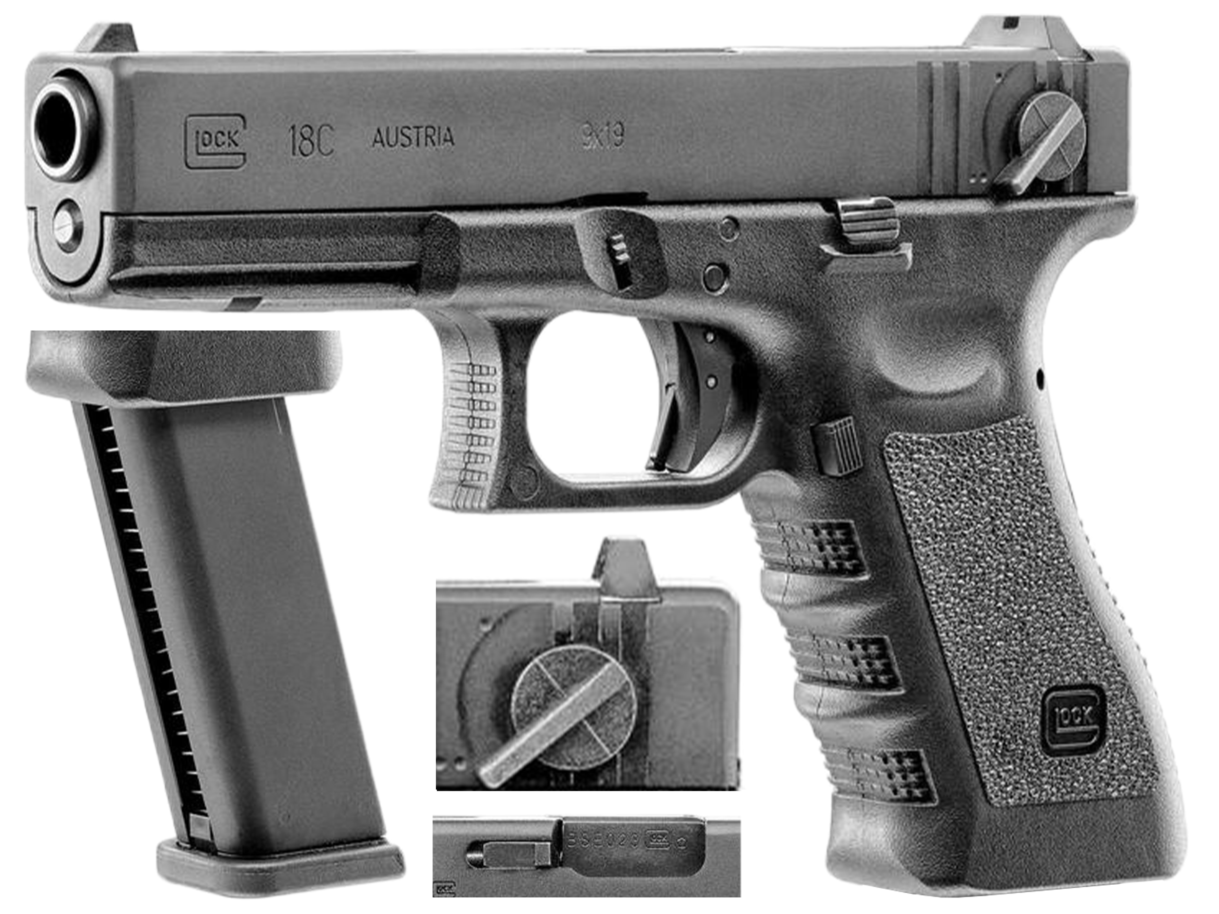 Ruchome elementy (zatrzask magazynka, dźwignia zrzutu zamka, spust z bezpiecznikiem), obsługa manualna oraz częściowe rozkładanie repliki są identyczne z prawdziwym Glockiem 18C.