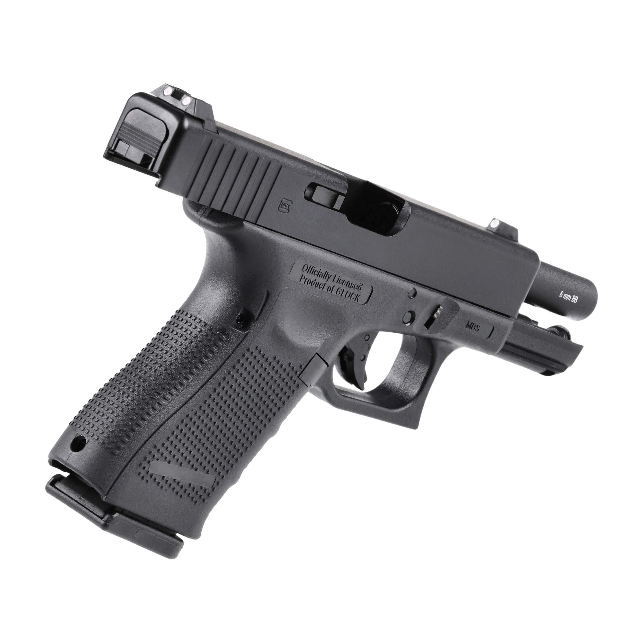 Do największych zalet repliki Glock 19 gen 4 należy system GBB (gas blow-back), który cofając po strzele zamek do tyłu, realistycznie imituje odrzut broni palnej. Po wystrzeleniu z magazynka wszystkich kulek zamek pozostaje w tylnym położeniu.