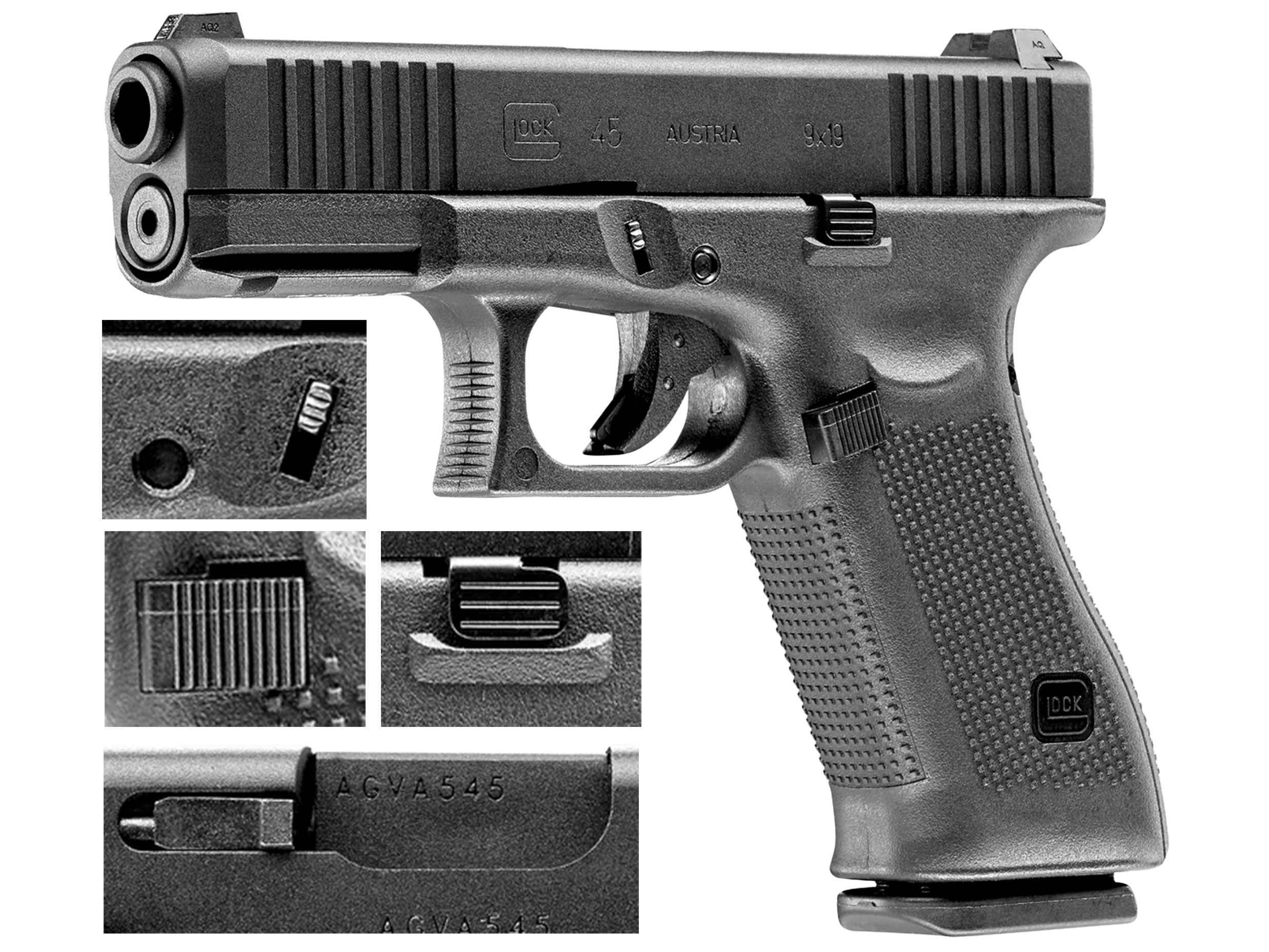 Model 45 to pistolet typu crossover, łączący elementy konstrukcji dwóch modeli pistoletów Glock tj. pełnowymiarowego szkieletu G17 genr 5 oraz zamka pistoletu G19.