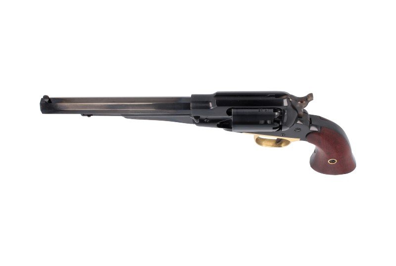 1858 Remington New Model Army .44, sześciostrzałowy kapiszonowy rewolwer czarnoprochowy Remington w kalibrze .44. Ładowany odprzodowo z ramą stalową zamkniętą.