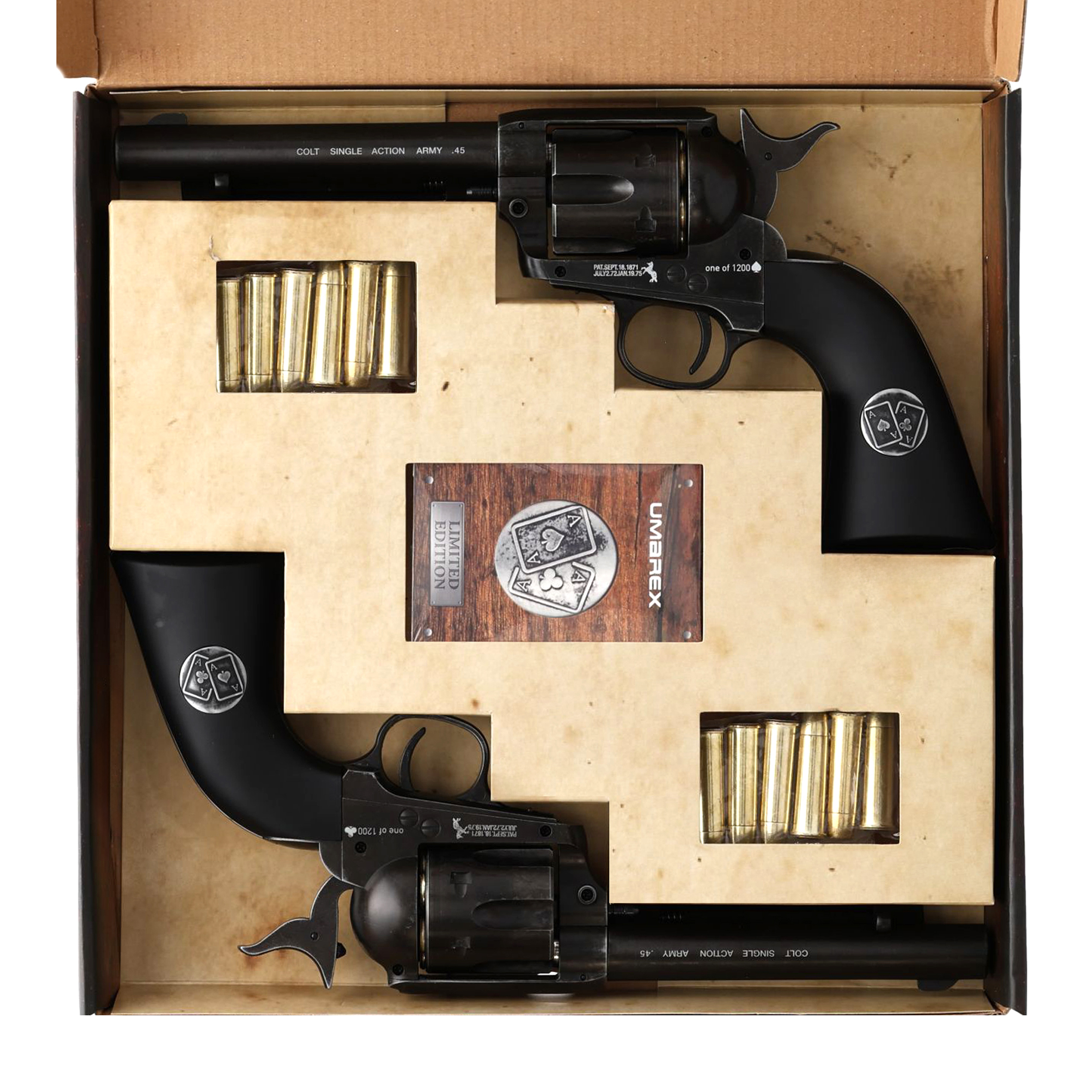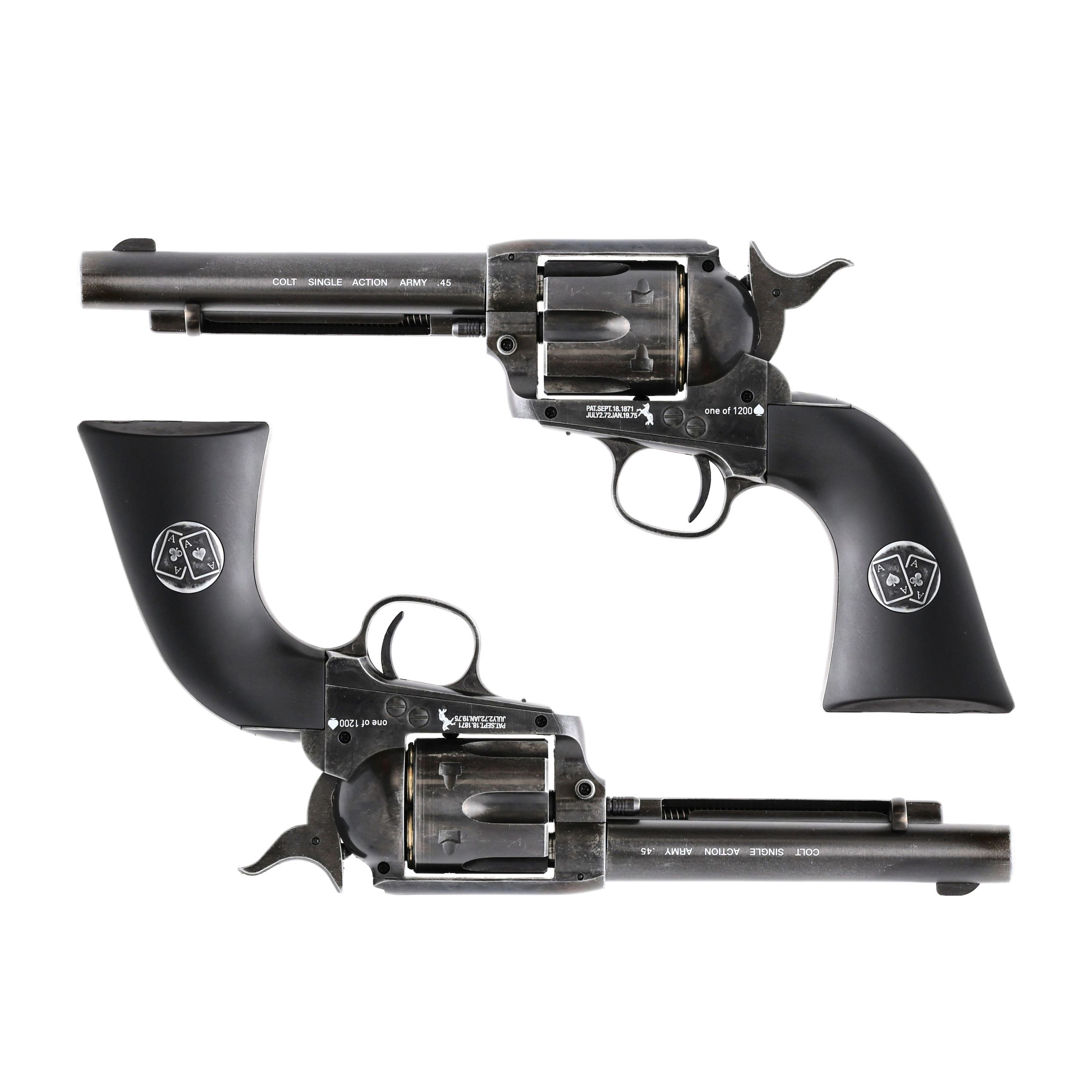 Colt SAA .45-5,5" antyk 4,5 mm BB CO2 to wspaniale wykonana wiatrówka, będąca wierną repliką legendarnego Colta SAA, rewolweru, który zmienił oblicze Dzikiego Zachodu. Wersja Aces Duel Set to stworzony z myślą o wzajemnej konkurencji edycja, zawierająca dwie sztuki rewolwerów oraz talię kart. O ile zdecydowanie nie polecamy prób odbywania westernowych pojedynków przy użyciu omawianej broni, o tyle towarzyskie strzelanie do celu oraz emocjonująca partia pokera są już jak najbardziej na miejscu.