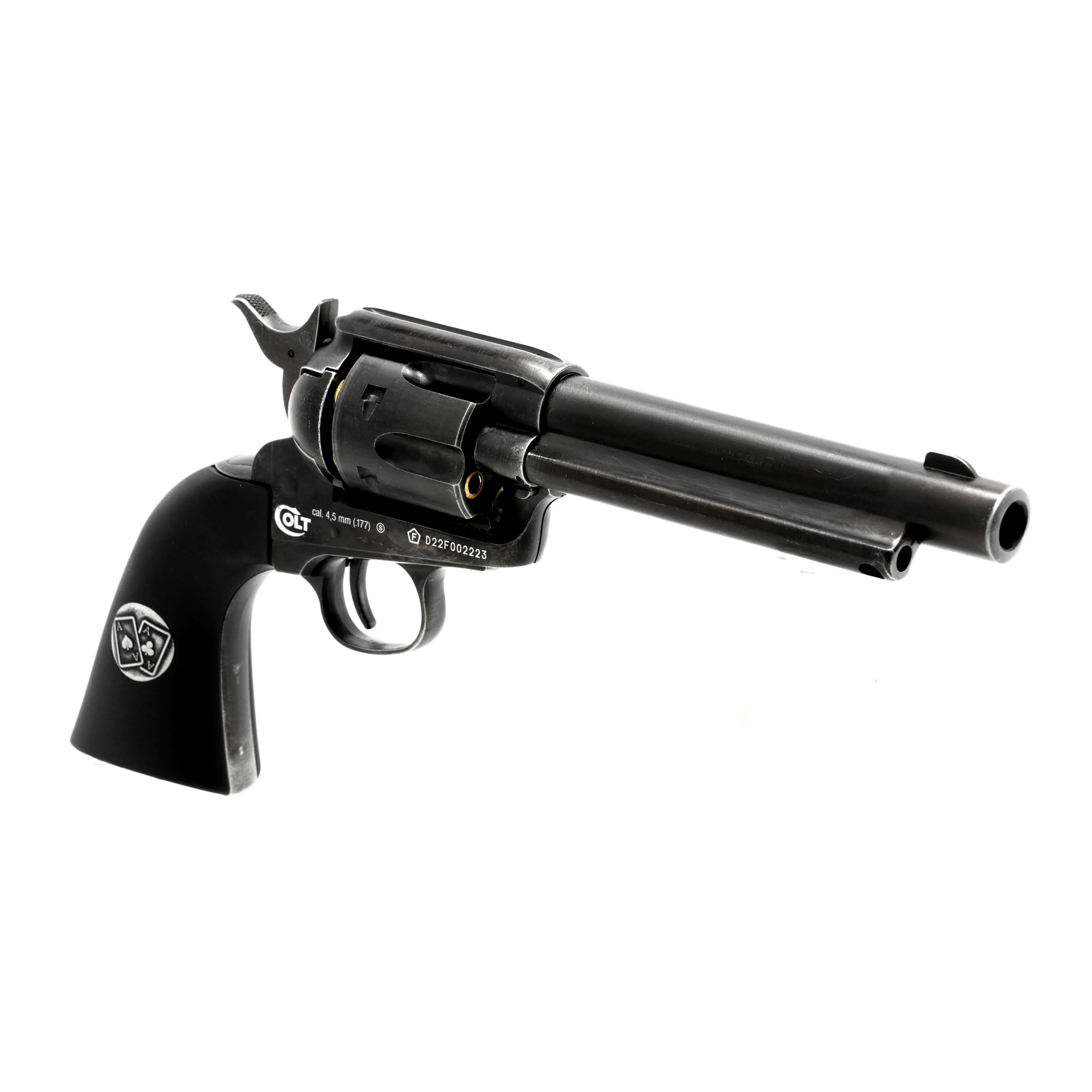 Klasyczny charakter rewolweru doskonale podkreślaj postarzane wykończenie oraz polimerowe okładziny rękojeści, które w omawianej wersji otrzymały wkomponowane medale z symbolem "ręki" kart. Podobnie jak w broni palnej, rękojeść rewolweru ma optymalny kąt, który wpływa na komfort oraz naturalny chwyt wiatrówki.