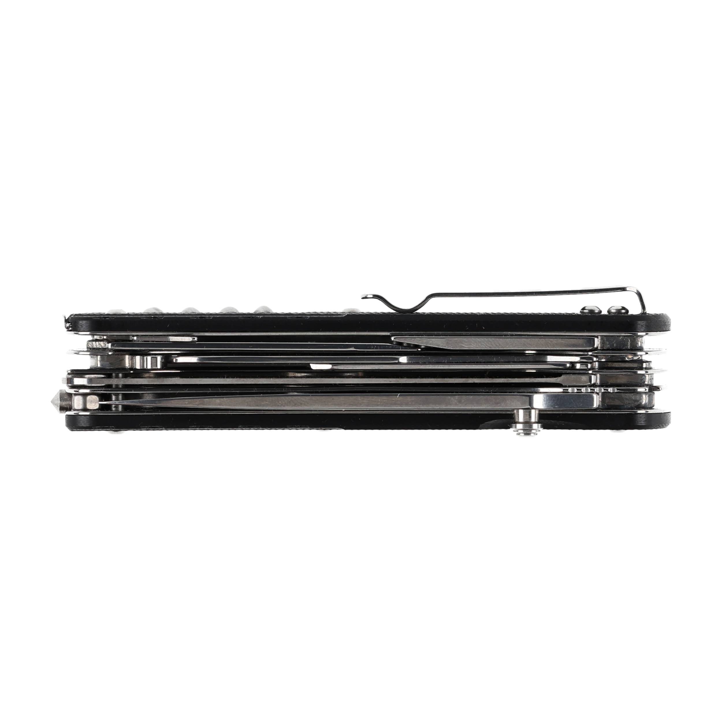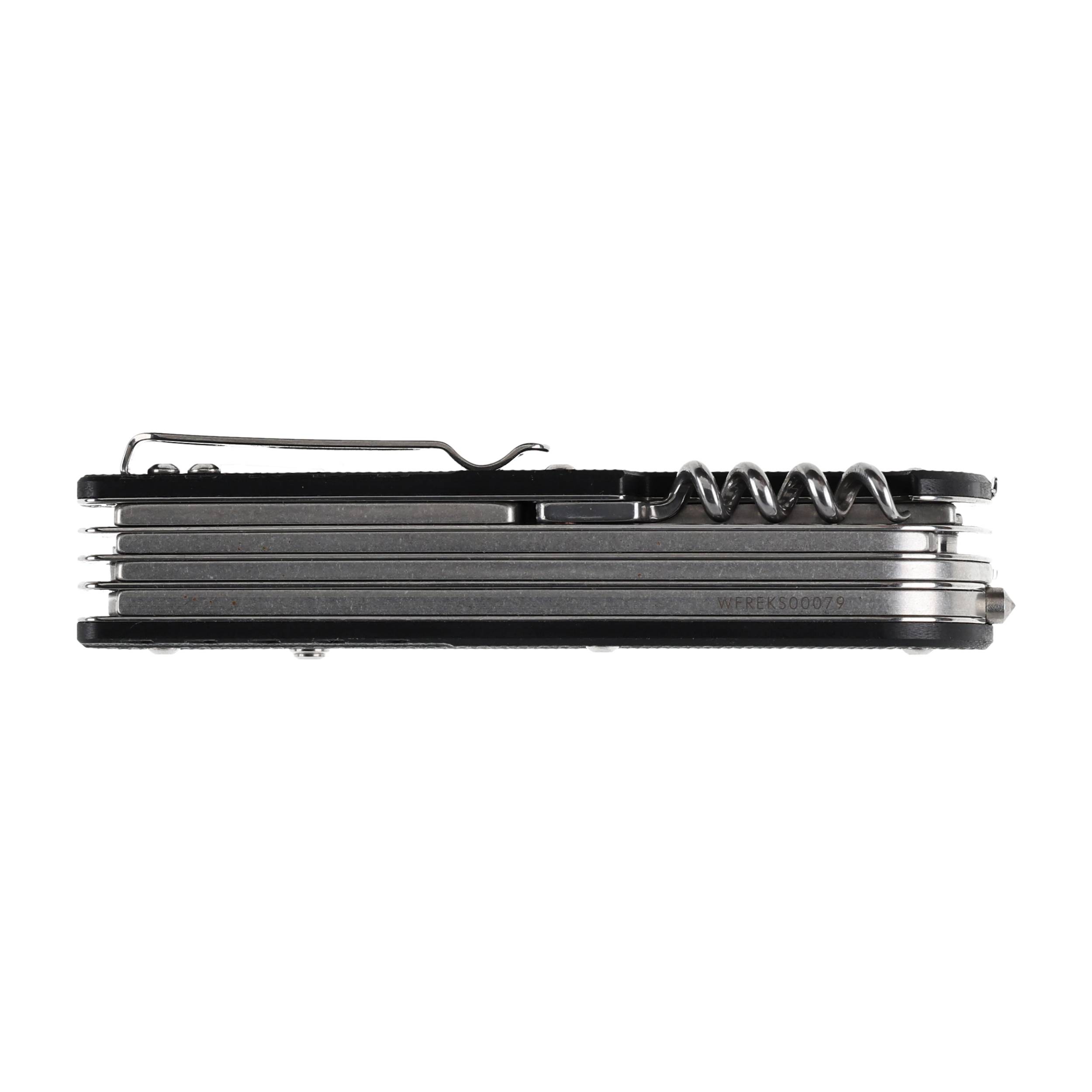 Wbudowane narzędzia: giętarka do drutu, klips, korkociąg, kółko do kluczy, nożyczki, otwieracz do butelek, ostrze duże, ostrze małe, pęseta/pinceta, piła do drewna, przebijak, szydło, ściągacz izolacji - duży, ściągacz izolacji - mały, śrubokręt płaski, śrubokręt płaski 3 mm,