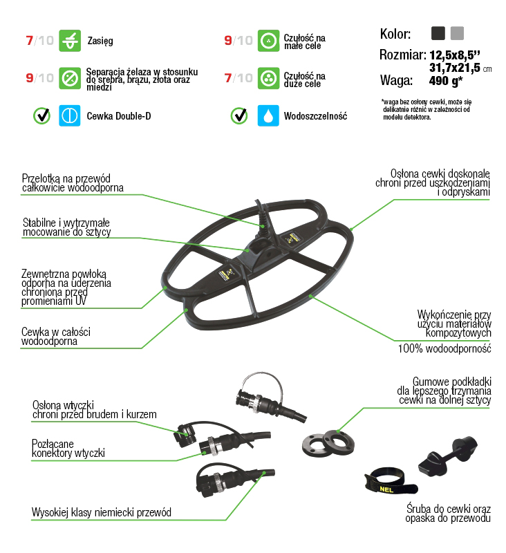 Cewka Nel Hunter 12,5x8,5" jest zaprojektowana tak aby sprostać poszukiwaniom na mocno zaśmieconym terenie. Cewka jest niezwykle lekka jak na swój rozmiar, tylko 490 g, dzięki czemu można z nią chodzić nawet cały dzień! Cewka ma doskonałą manewrowość i sprawdza się przy dużych, średnich i małych celach, zwłaszcza na gruntach silnie zaśmieconych żelazem. Zaleca się, jako zamiennik dla standardowych cewek. Cewka ta jest zalecana do stosowania w otwartym terenie, korpus wypełniony żywicą epoksydową, dodatkowo pokryty powłoką ochronną. Doskonale radzi sobie w warunkach wysokiego i średniego zasolenia gleby, jest w pełni wodoodporna co umożliwia poszukiwania w wodzie. Zalecana dla profesjonalistów i amatorów.
