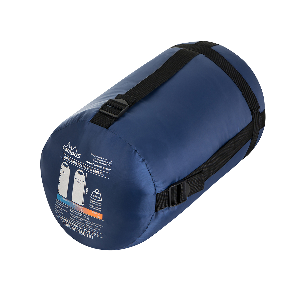 Campus Cougar 150 wyróżnia się dobrymi właściwościami termicznymi, wysoką jakością wykonania, zastosowaniem nowoczesnych technologii i materiałów m.in.: opatentowanego wypełnienia Hollowfiber oraz lekkich i wytrzymałych tkanin poliestrowych. Śpiwór ma dwukierunkowy zamek, umożliwiający rozpinanie także od dołu oraz system regulacji temperatury wewnątrz śpiwora. Dużym udogodnieniem jest system ANTI-BITE, który zapobiega wcinaniu się tkaniny w zamek. Komfort użytkowania zapewnia zamek rozpinany na całej długości dwóch boków. Po rozpięciu zamka śpiwór można łatwo przeistoczyć w standardową kołdrę. Do wygodnego przenoszenia Cougar 150 służy pokrowiec, z pasami kompresyjnymi, które ułatwiają zmniejszenie objętości śpiwora.