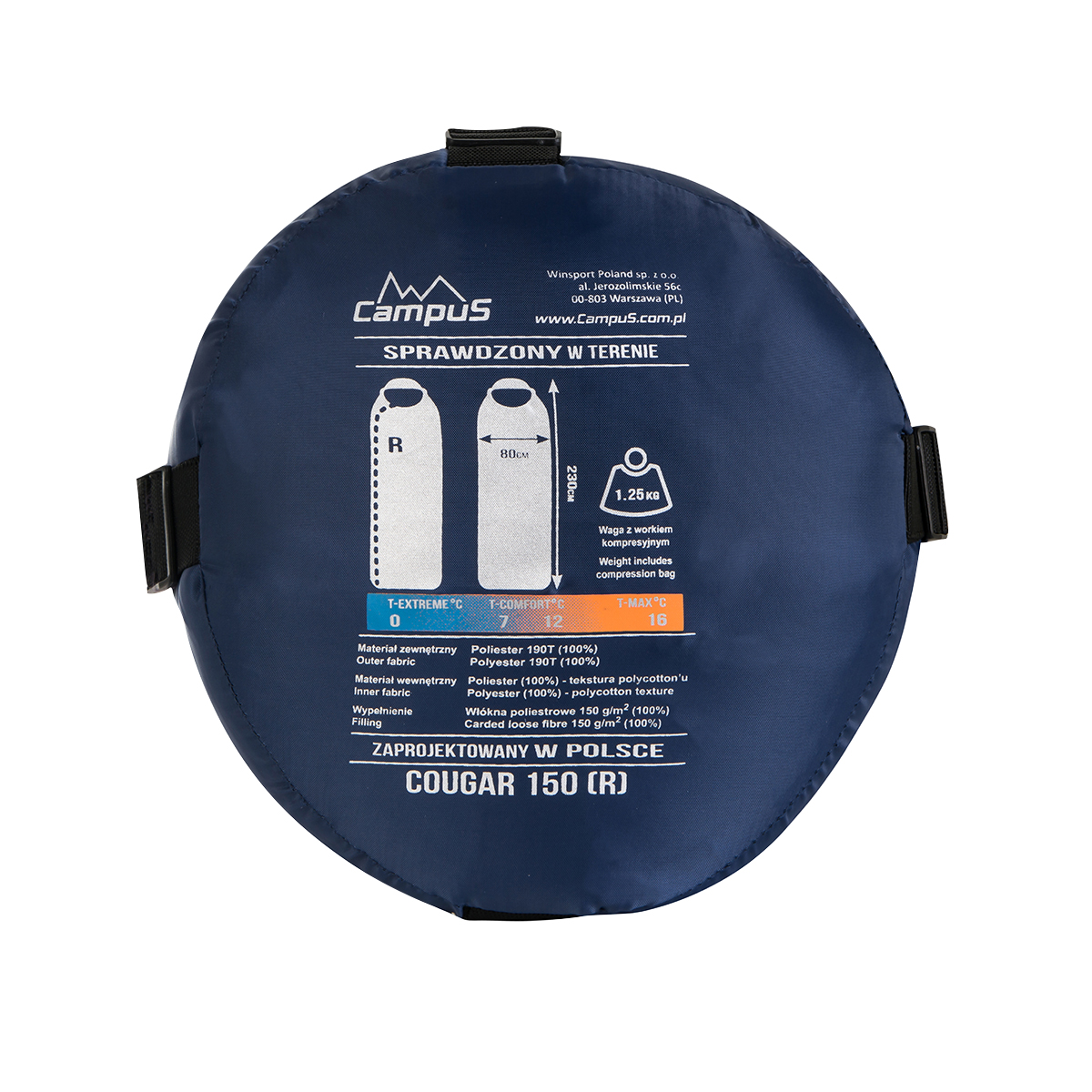 Śpiwór przeznaczony jest do użytkowania od wiosny do jesieni. Campus COUGAR 150 zapewnia komfort spania przy temperaturze od 7°. Temperatura komfortu to taka, w które człowiek zachowuje równowagę termiczną i nie odczuwa zimna. Wartość ta odnosi się do kobiety po średnim wysiłku. Jest to kluczowy parametr, którym podczas wyboru śpiwora powinny kierować się kobiety i osoby łatwo marznące. Ekstremalne temperatura dla tego modelu śpiwora to 0°. Spanie w temperaturze poniżej tej wartości może doprowadzić do hipotermii, dlatego w takich warunkach nie zaleca się przebywanie w śpiworze dłużej niż 6 do 8 godzin.