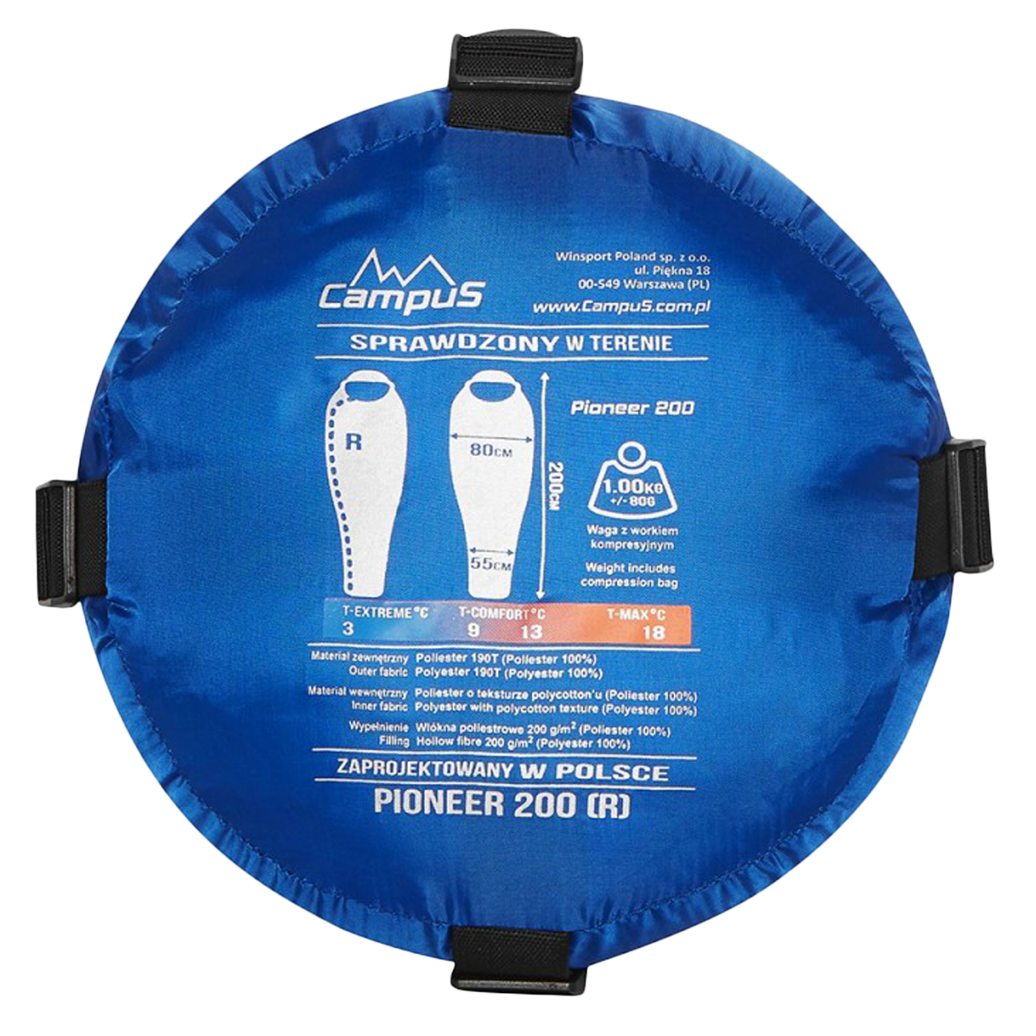 Model Campus PIONEER 200 to idealny śpiwór na letni treking lub biwak pod chmurką. PIONEER 200 wyróżnia się dobrymi właściwościami termicznymi, wysoką jakością wykonania, zastosowaniem nowoczesnych technologii i materiałów m.in.: opatentowanego wypełnienia Hollowfiber oraz lekkich i wytrzymałych tkanin poliestrowych. Śpiwór ma podwójny zamek (rozpinany od wewnątrz) oraz dodatkowy zamek w dnie pozwalający regulowanie temperatury wewnątrz śpiwora. Do wygodnego przenoszenia Hobo 150 służy pokrowiec, z pasami kompresyjnymi, które ułatwiają zmniejszenie objętości śpiwora. Wymiary śpiwora po skompresowaniu wynoszą 36 × 20 cm. Pozwala to na wygodnie przytroczenie go do plecaka turystycznego lub schowanie w jego wnętrzu bez znacznej utraty przestrzeni bagażowej.