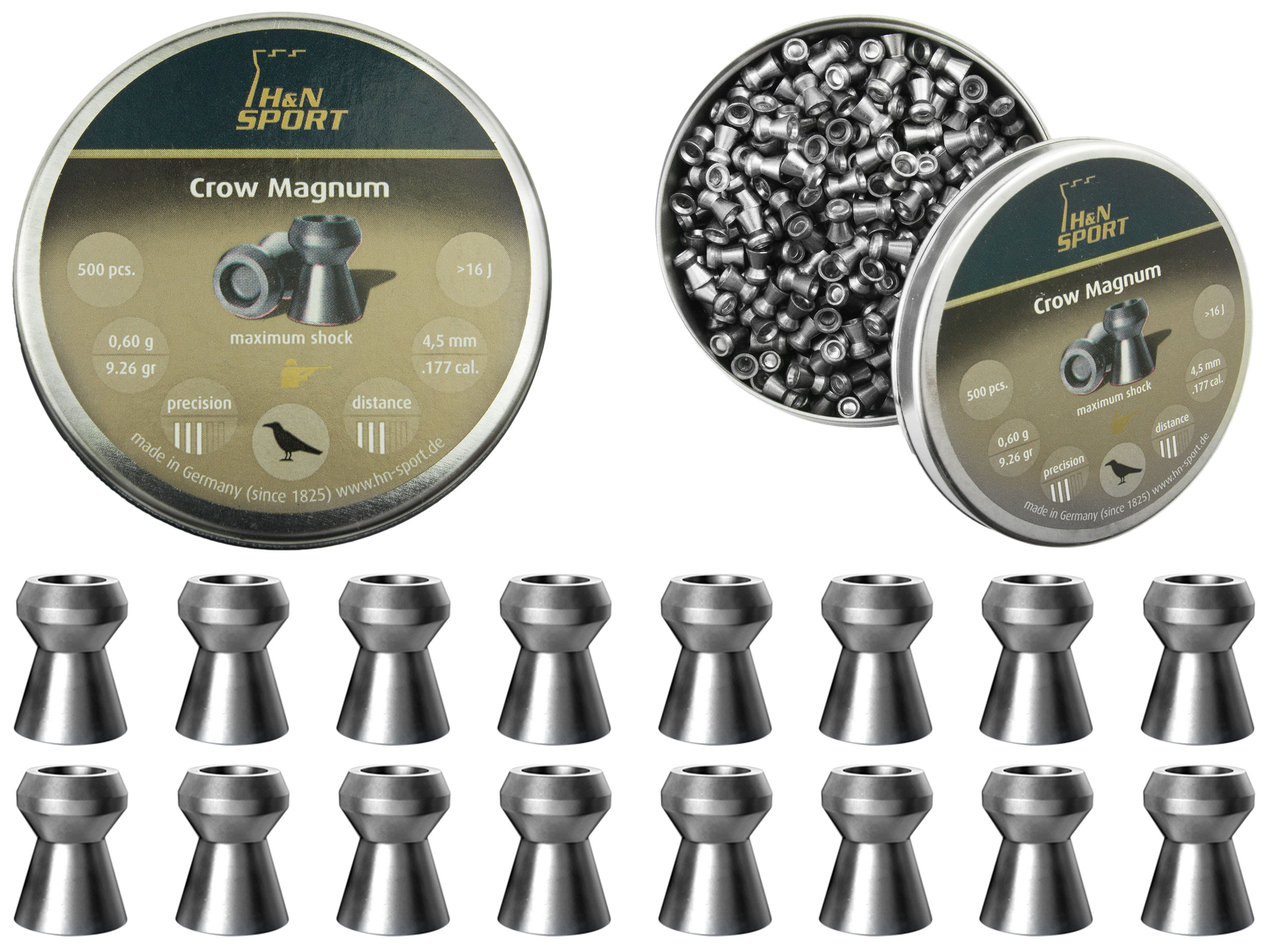 Śrut Crow Magnum Diabolo 4,5 mm – śrut rozrywający o ponadprzeciętnej wadze, gładkość oraz staranność wykonania sprawia że jest bardzo celny. Śrut różni się tym od Halow Pointa, że ma szerszy otwór z przodu (jeszcze większy efekt w rozrywaniu) oraz jest cięższy.