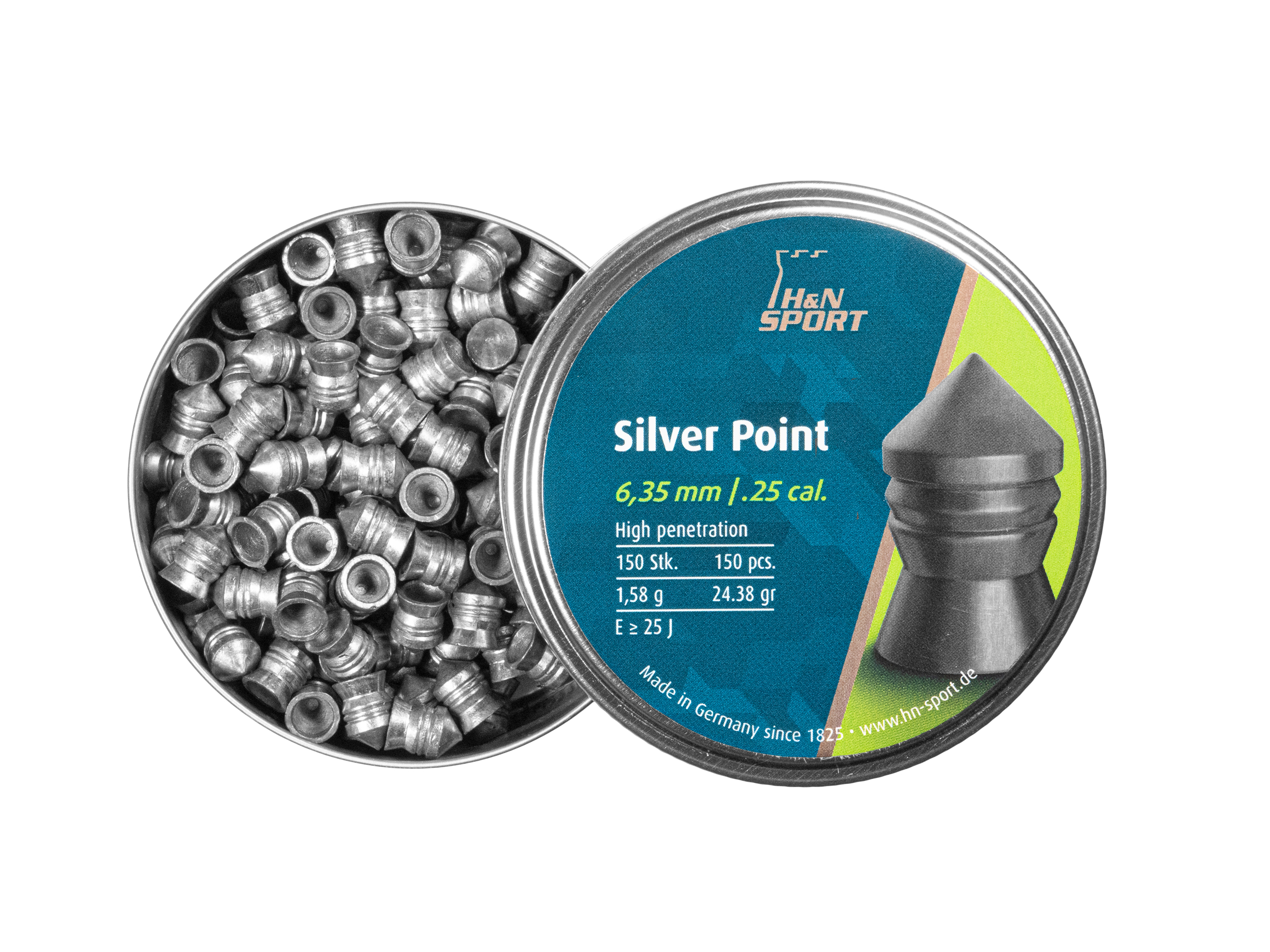 Śrut ma dosyć nietypowy kształt, w postaci główki ze żłobieniami zakończonej szpicem. H&N Silver Point 6,35 mm jest przeznaczony wyłącznie do wiatrówek o bardzo dużej prędkości początkowej, do strzelania terenowego.